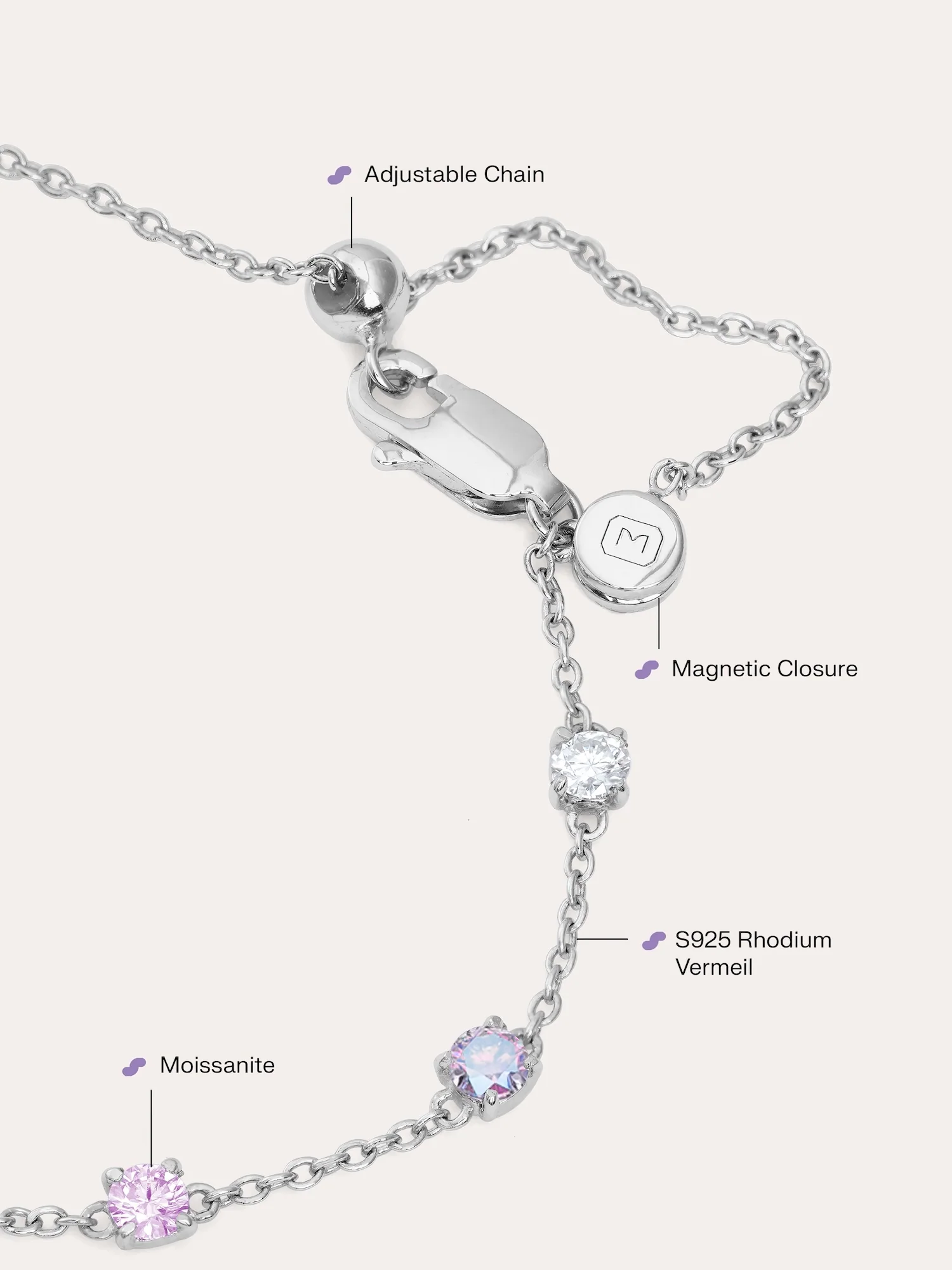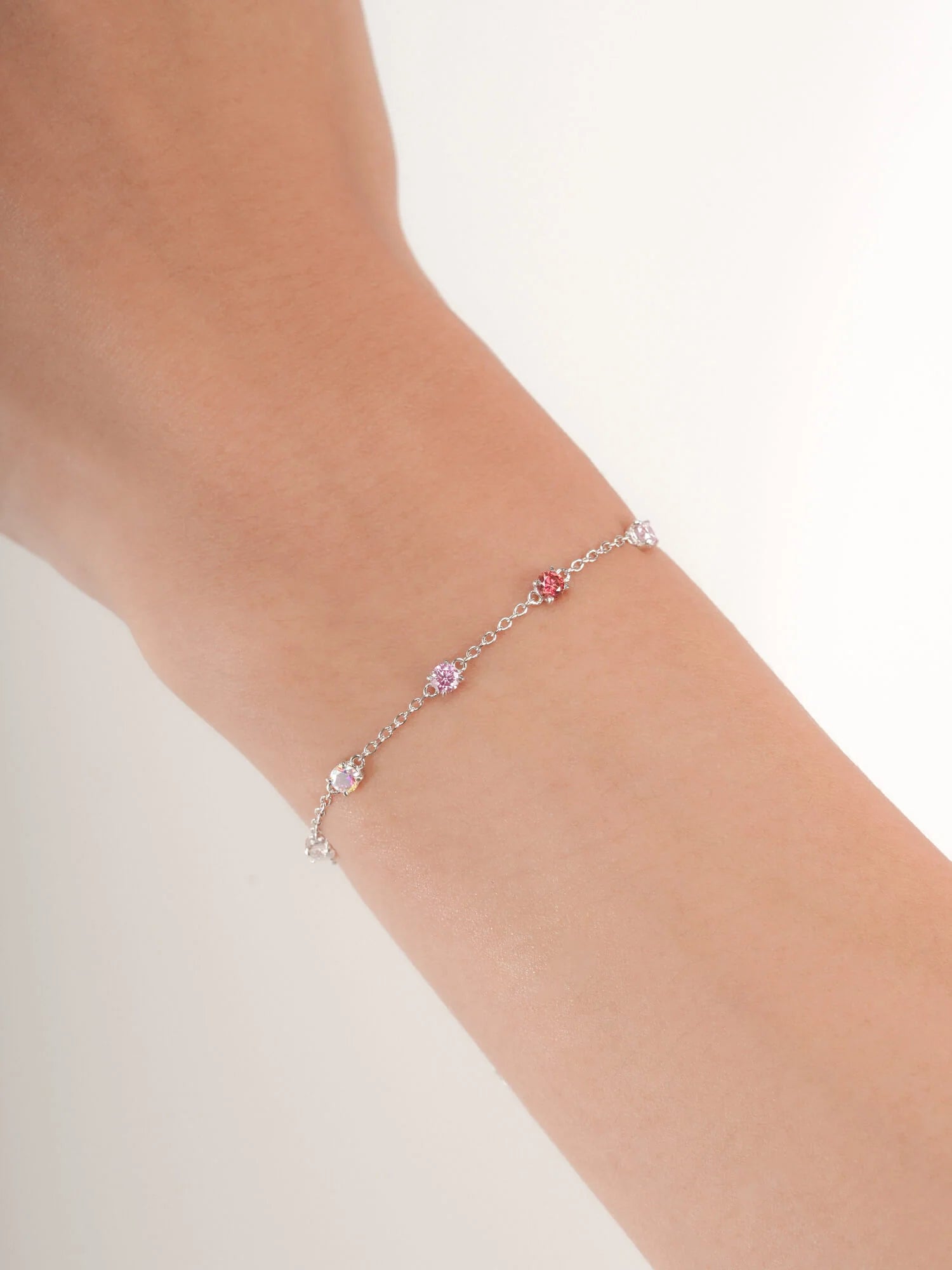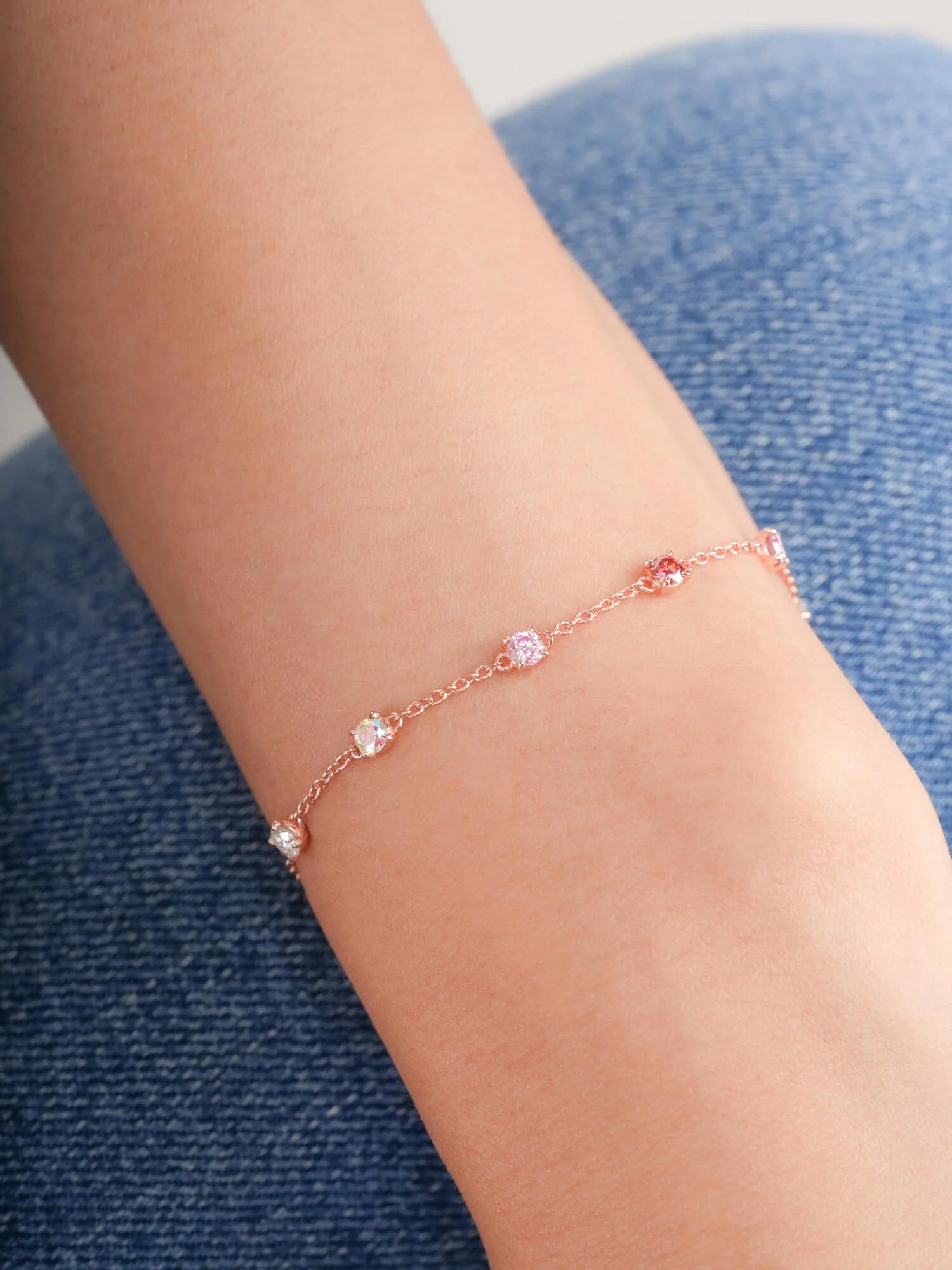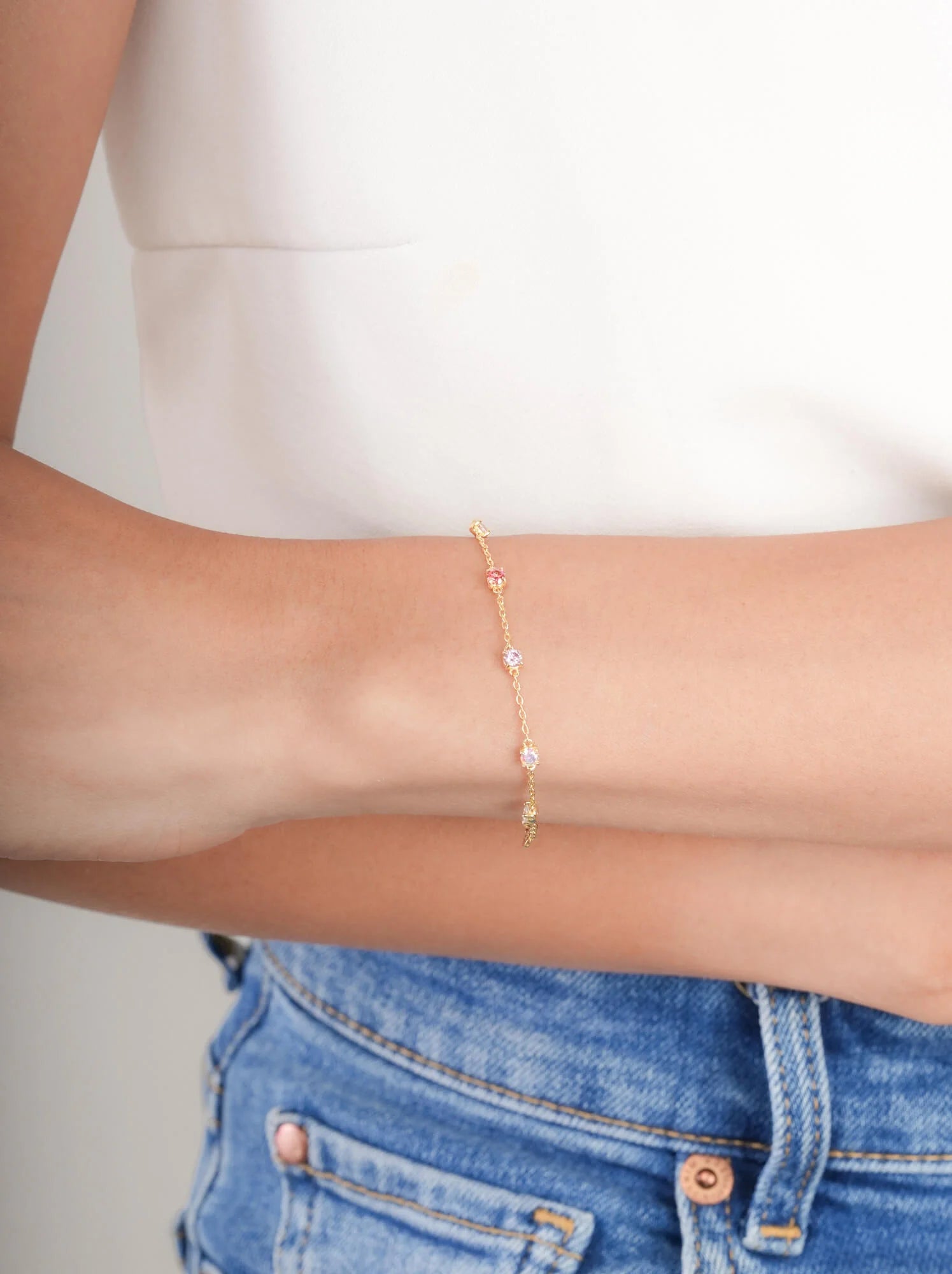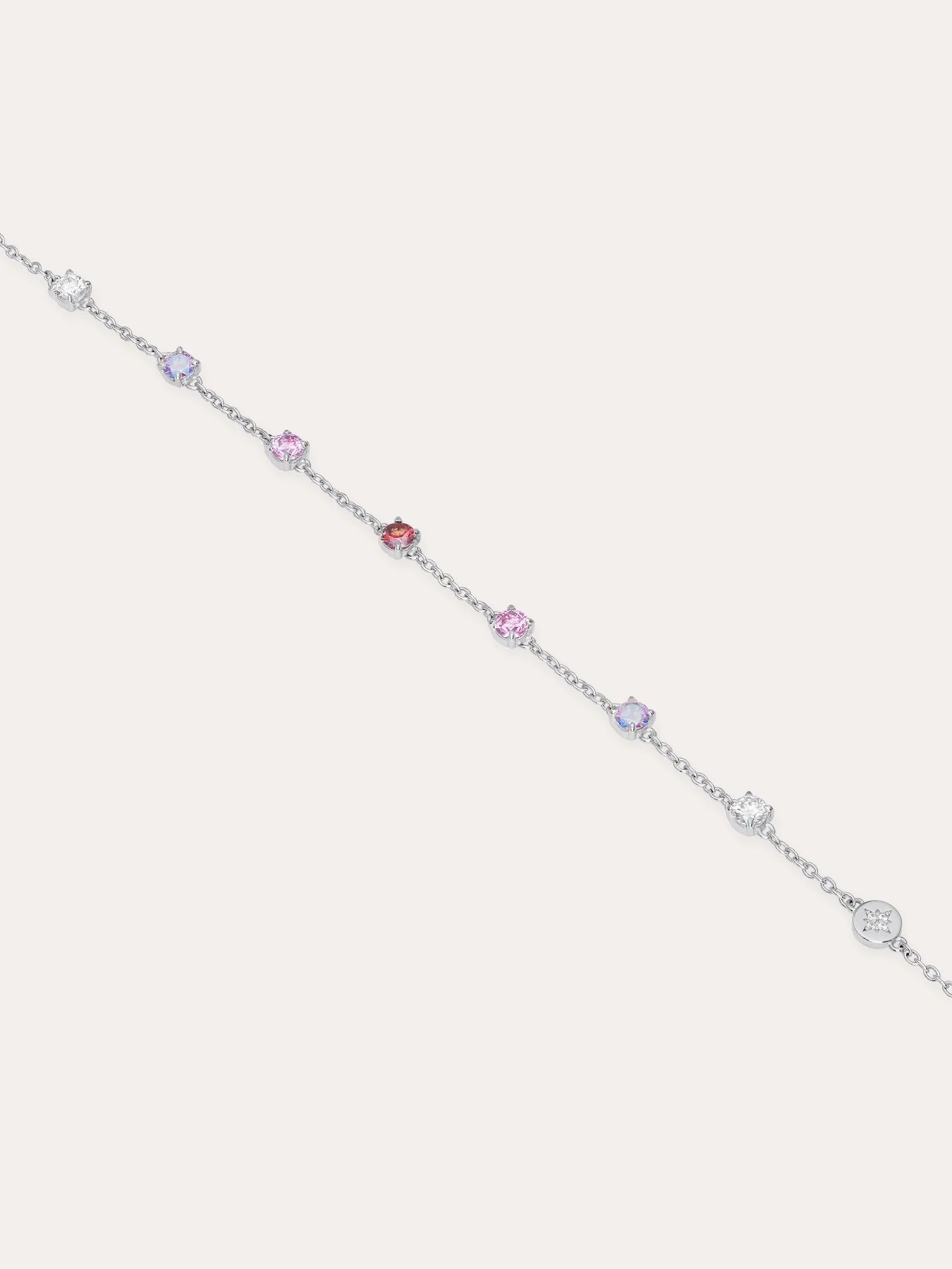 This bracelet features a gradient of 7 hand-set moissanite stones in ombre shades of red, pink, and white. Inspired by the beautiful colors of spring flowers, this delicate design symbolizes new beginnings. It is handcrafted in 18k gold vermeil.