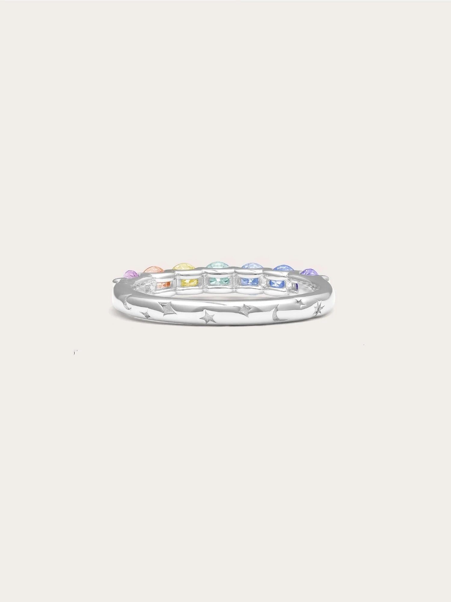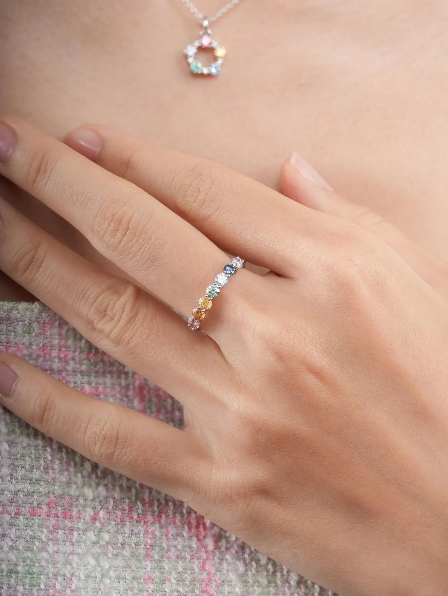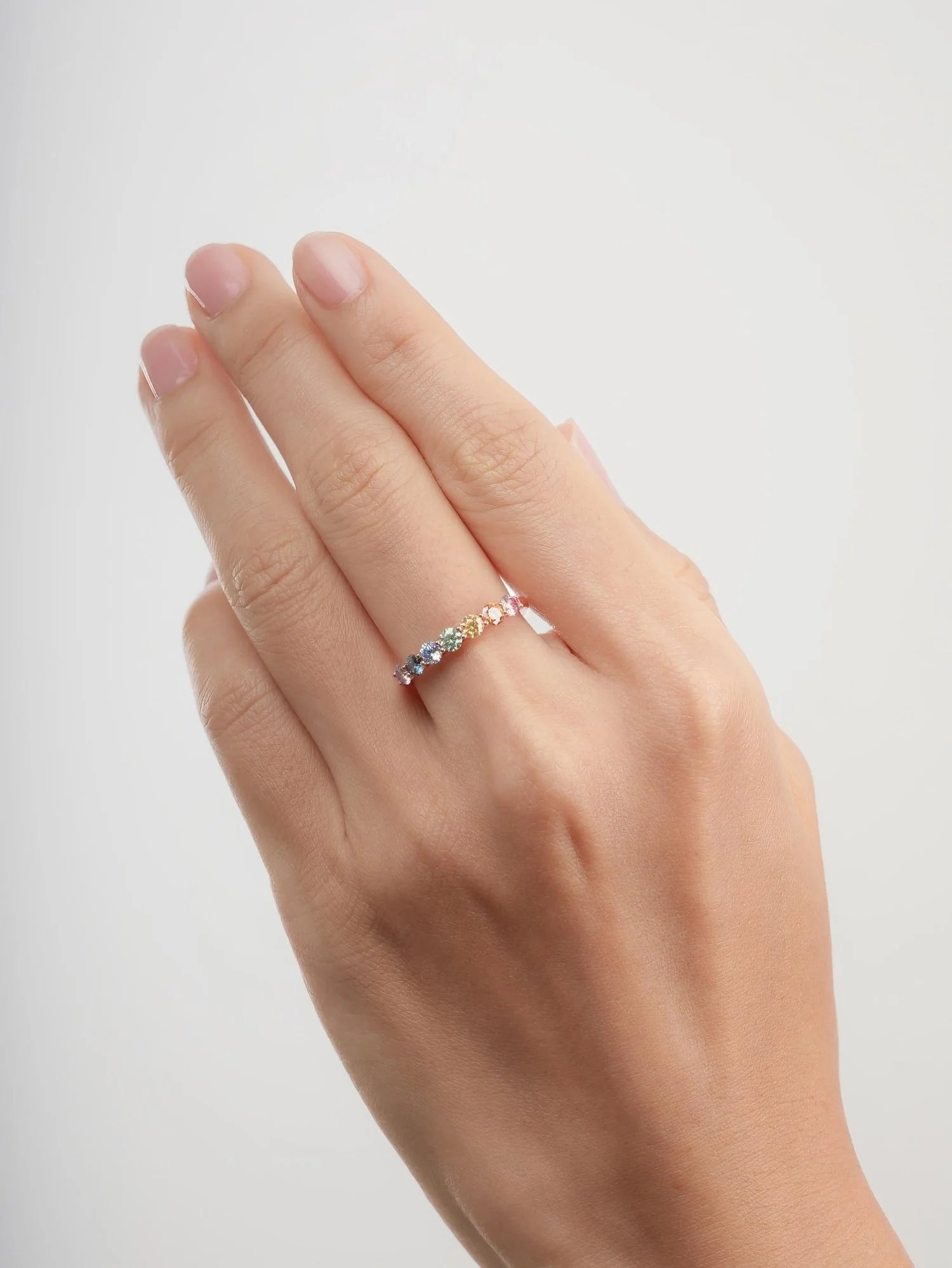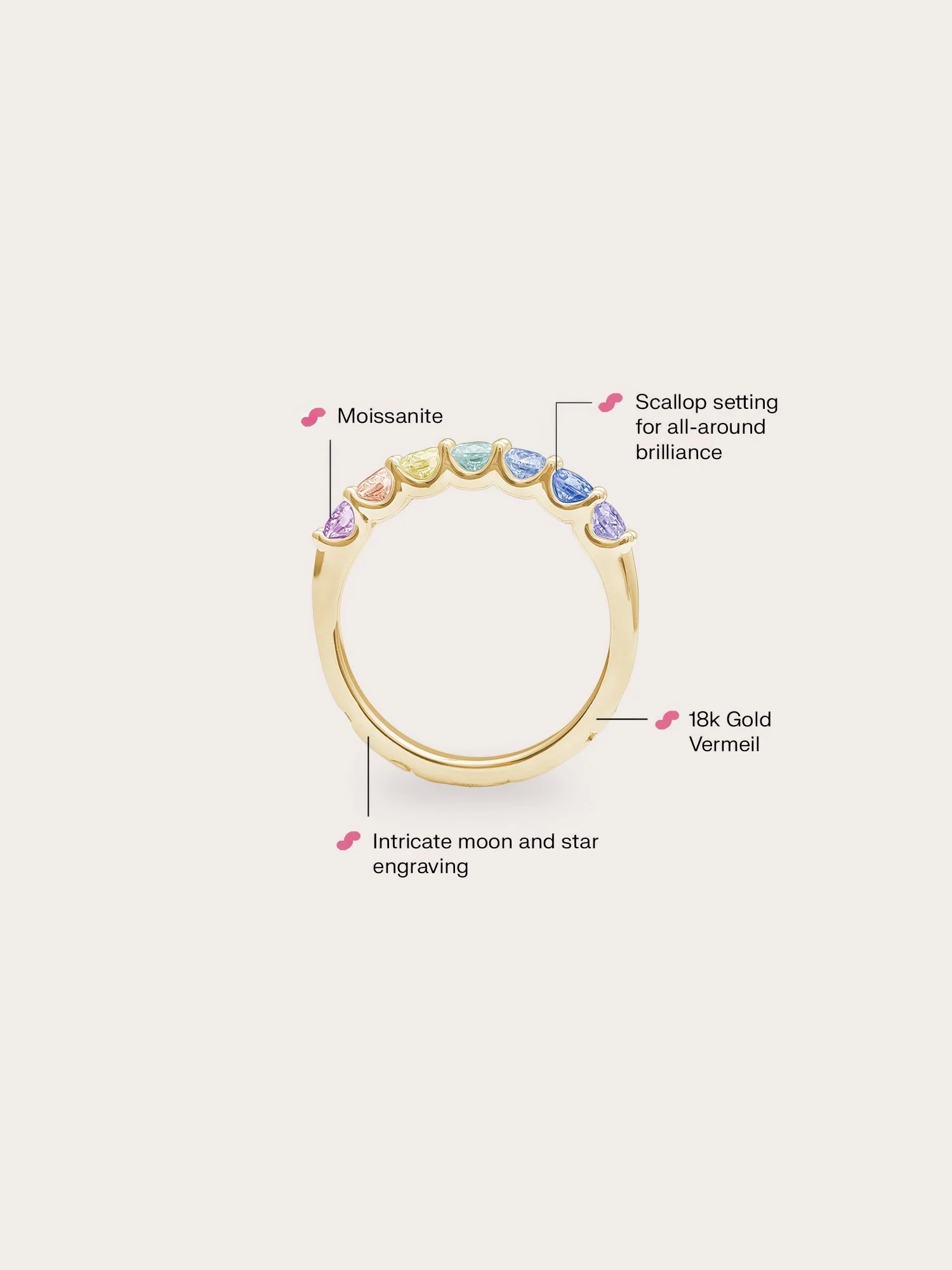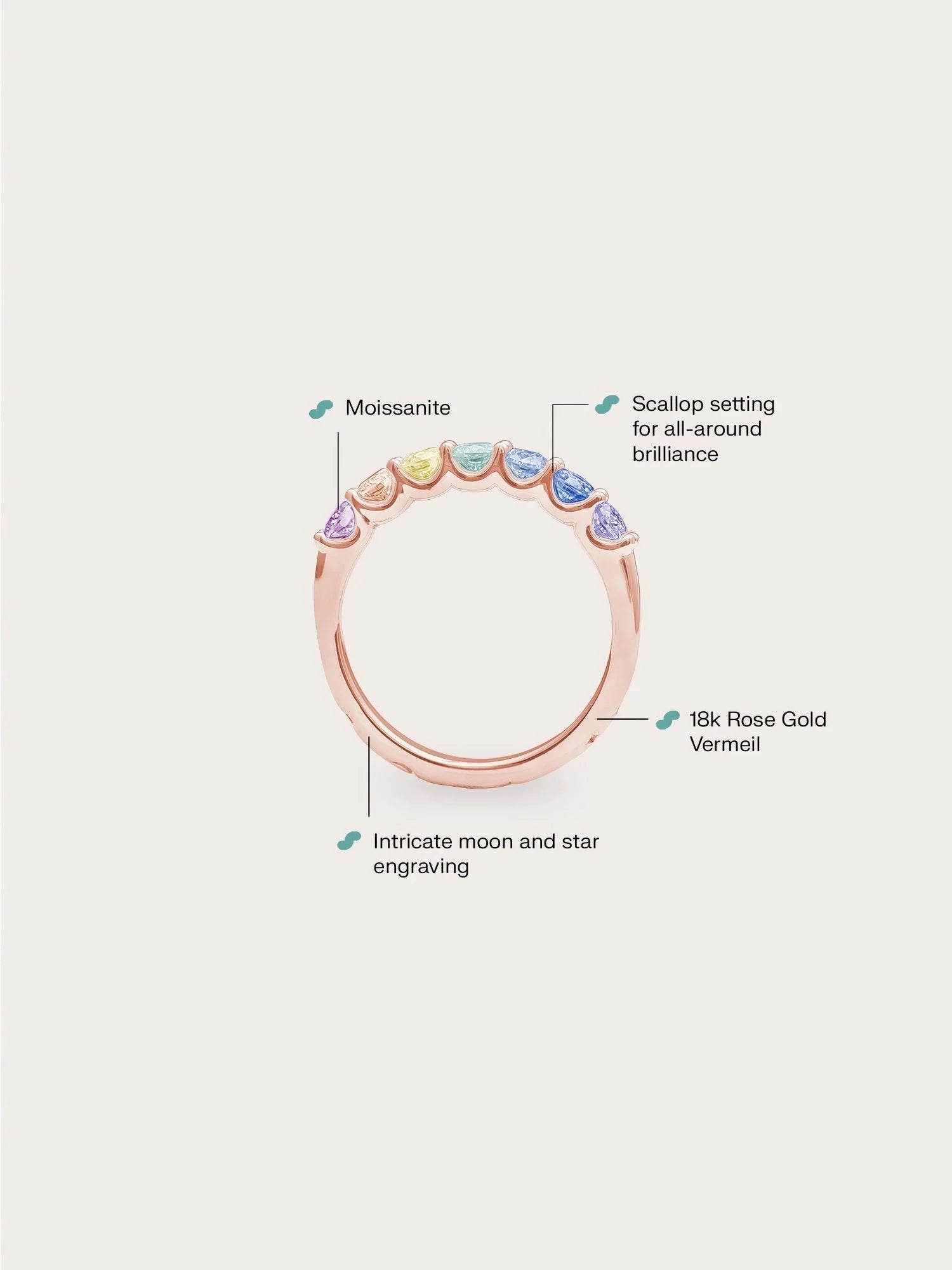 Feel joy and hope with this rainbow moissanite eternity ring. This half eternity ring is set with dazzling rainbow moissanites, reminiscent of the beauty of a rainbow after a soft rain. It's hand - crafted with 18k rose gold vermeil.