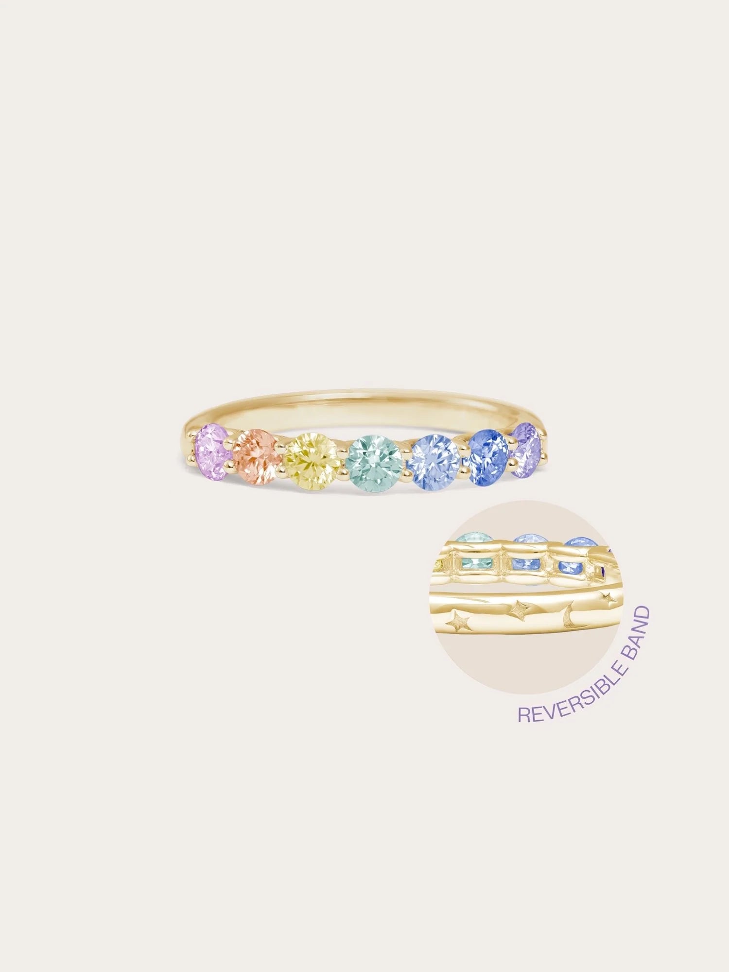 It has a reversible design, offering two different looks in one ring. The other side features a sparkly pattern like a night sky with faint moon and star glimmers.