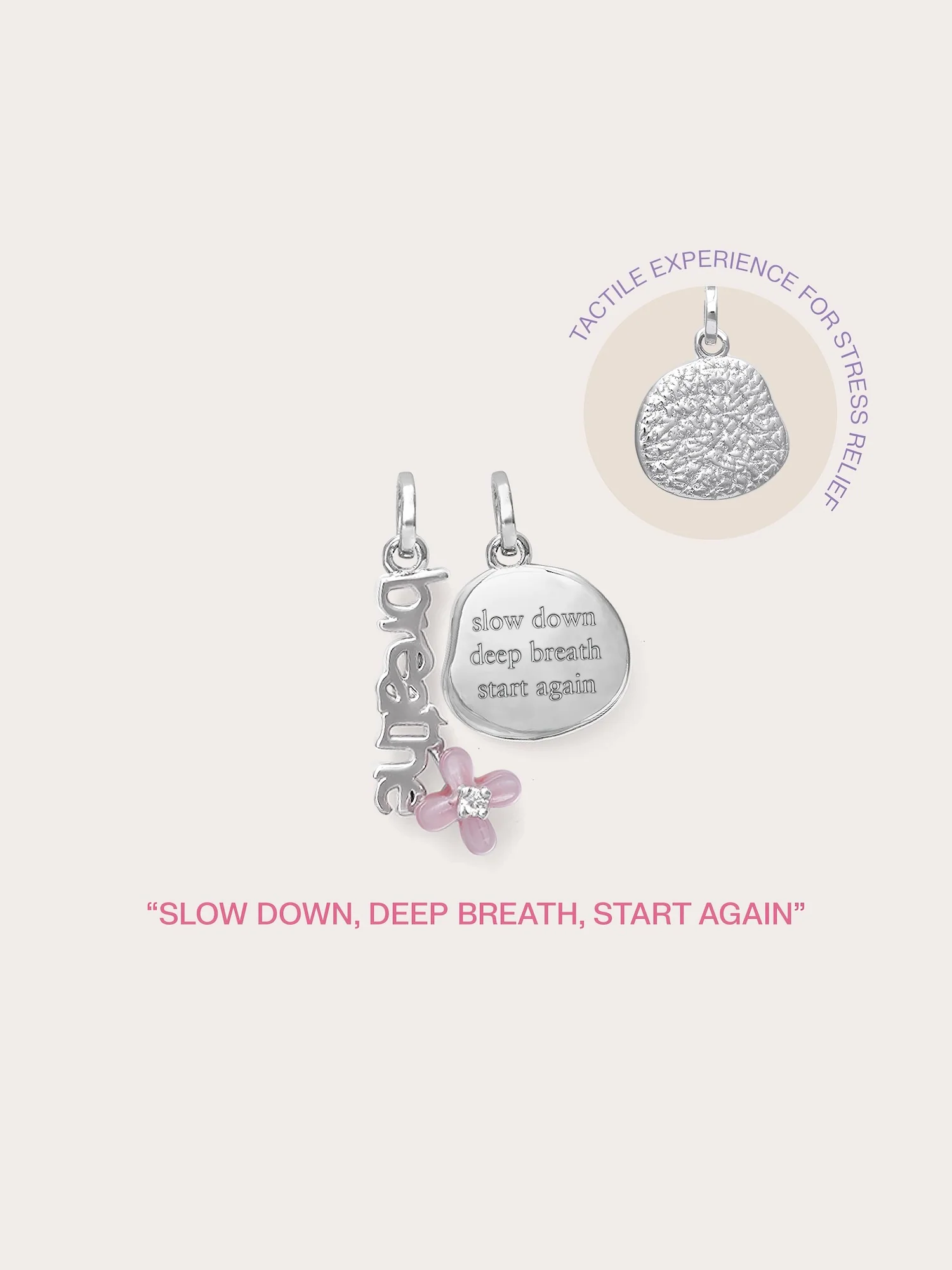 This two-piece set includes a word charm and a bean-shaped charm. The bean charm has a calming message engraved on the front and a textured back for a soothing touch. It's great for promoting calmness in daily life.