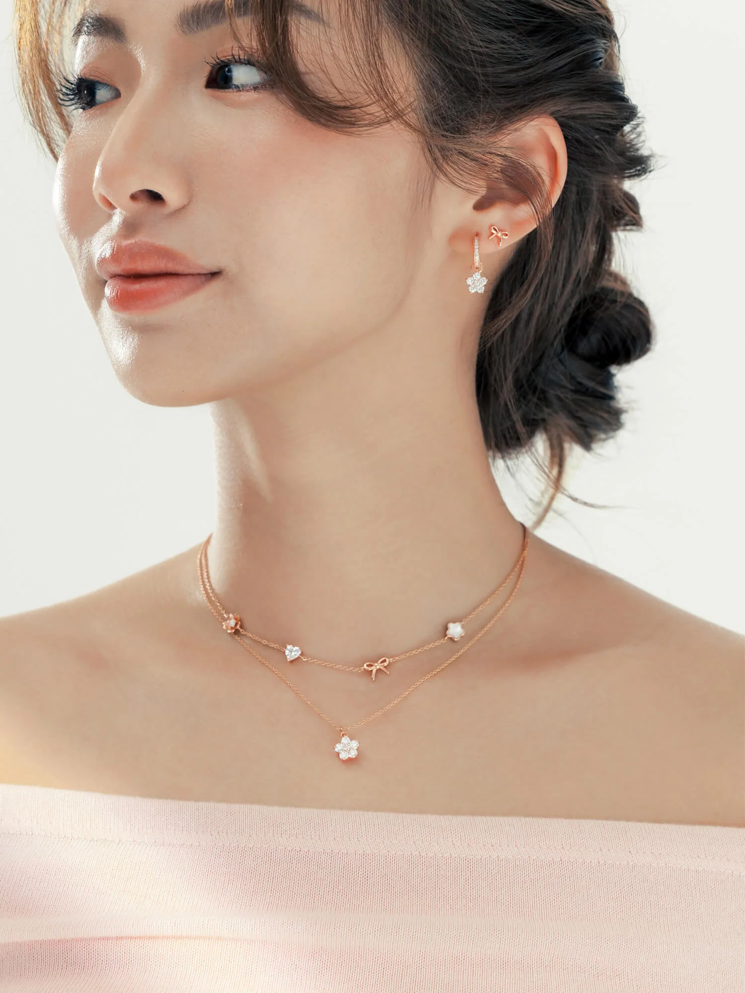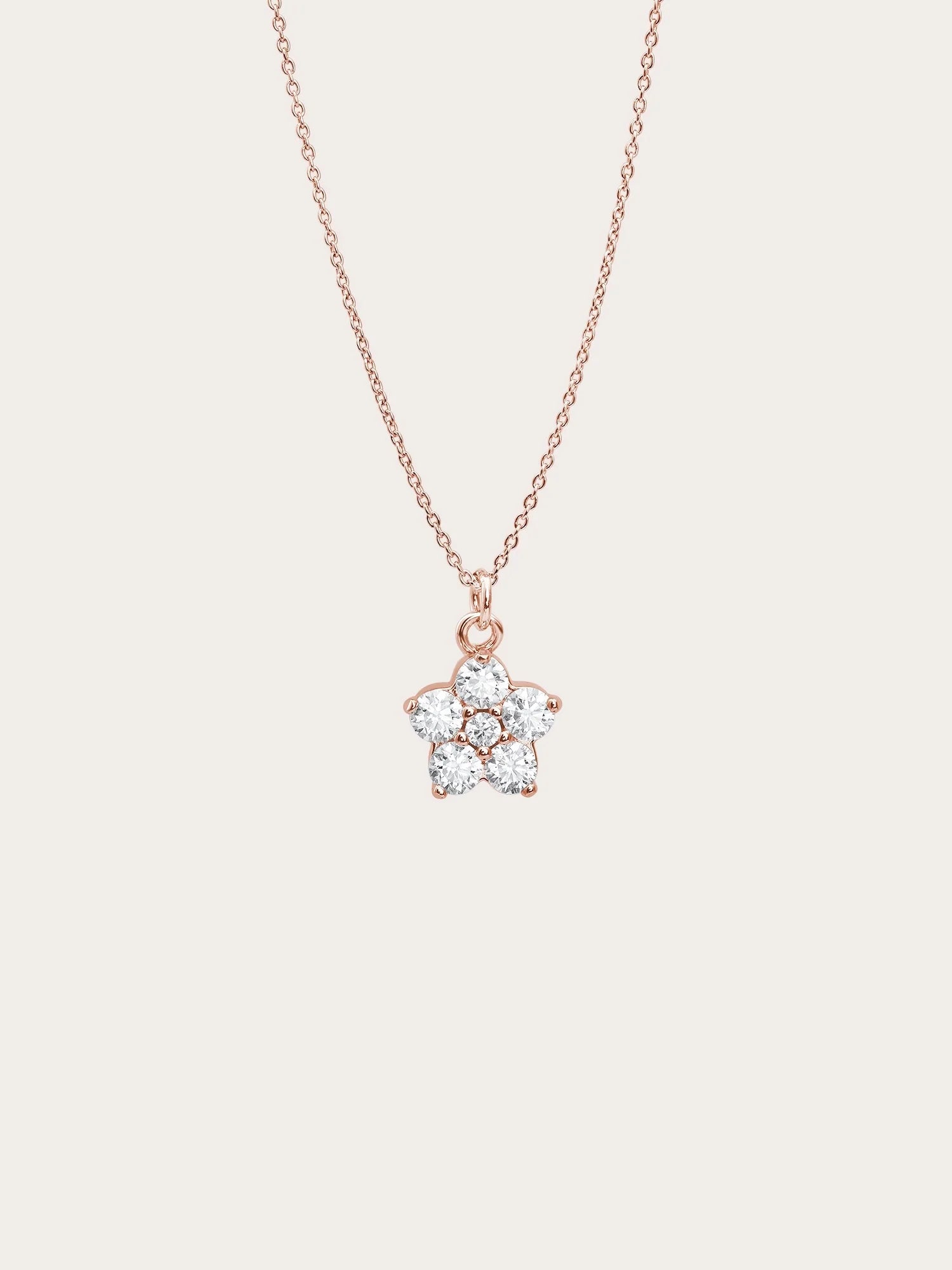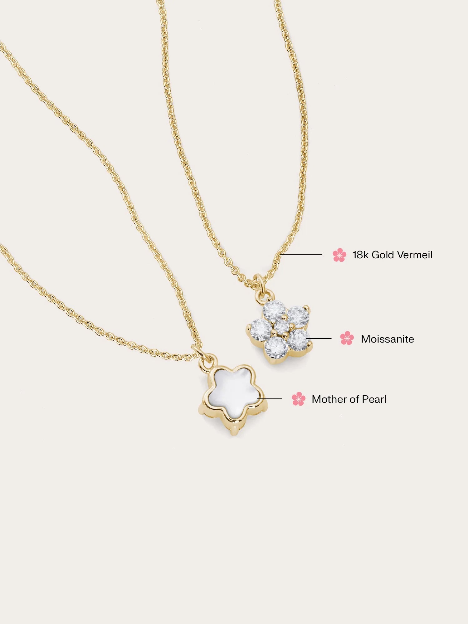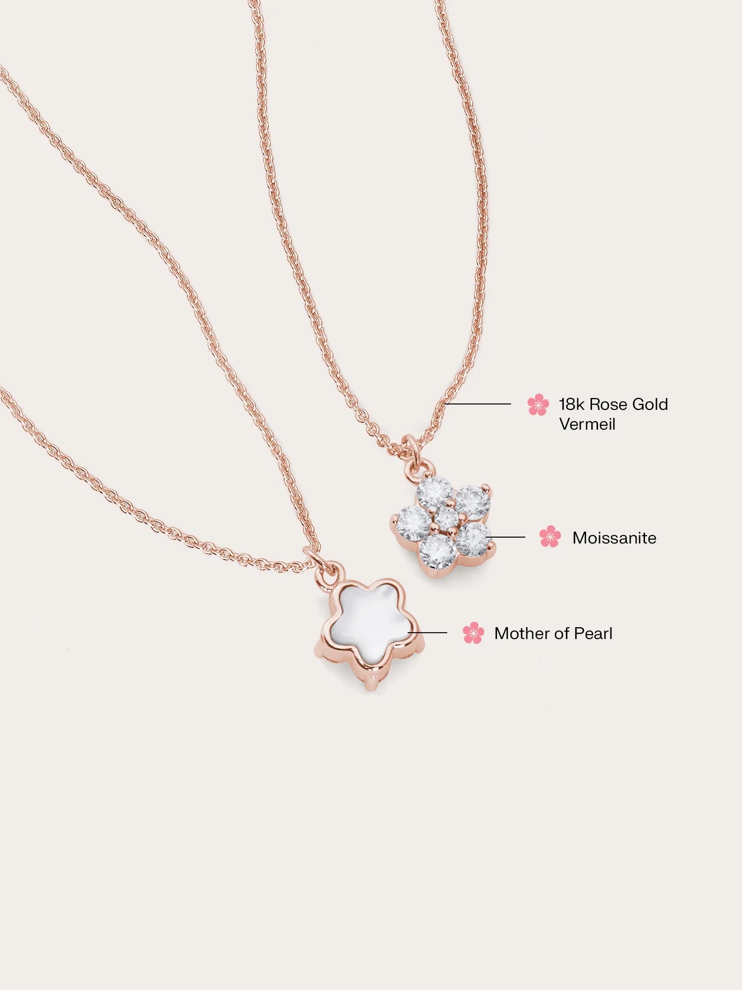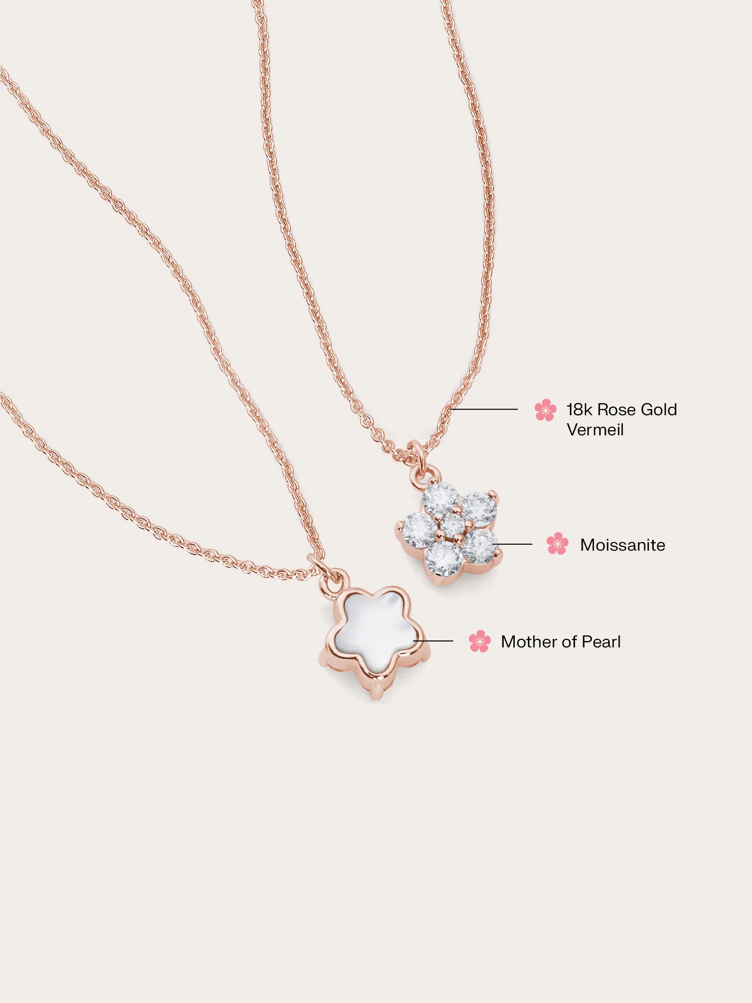 This reversible necklace has a practical two-in-one design. One side presents a finely carved puffy mother-of-pearl cherry blossom, and the other side glistens with radiant moissanites, combining softness and brilliance in one item. It's hand - crafted in 18k rose gold vermeil.