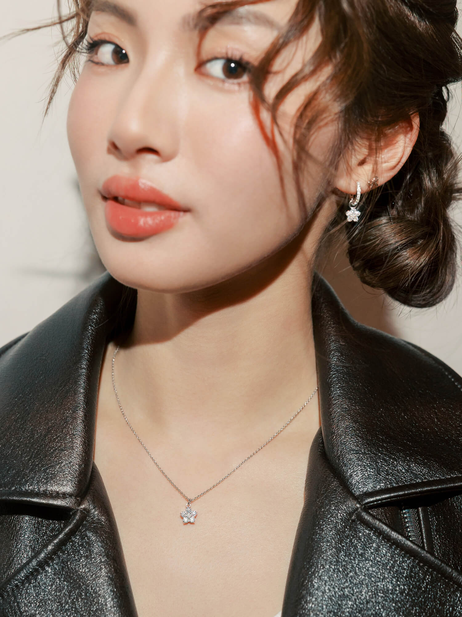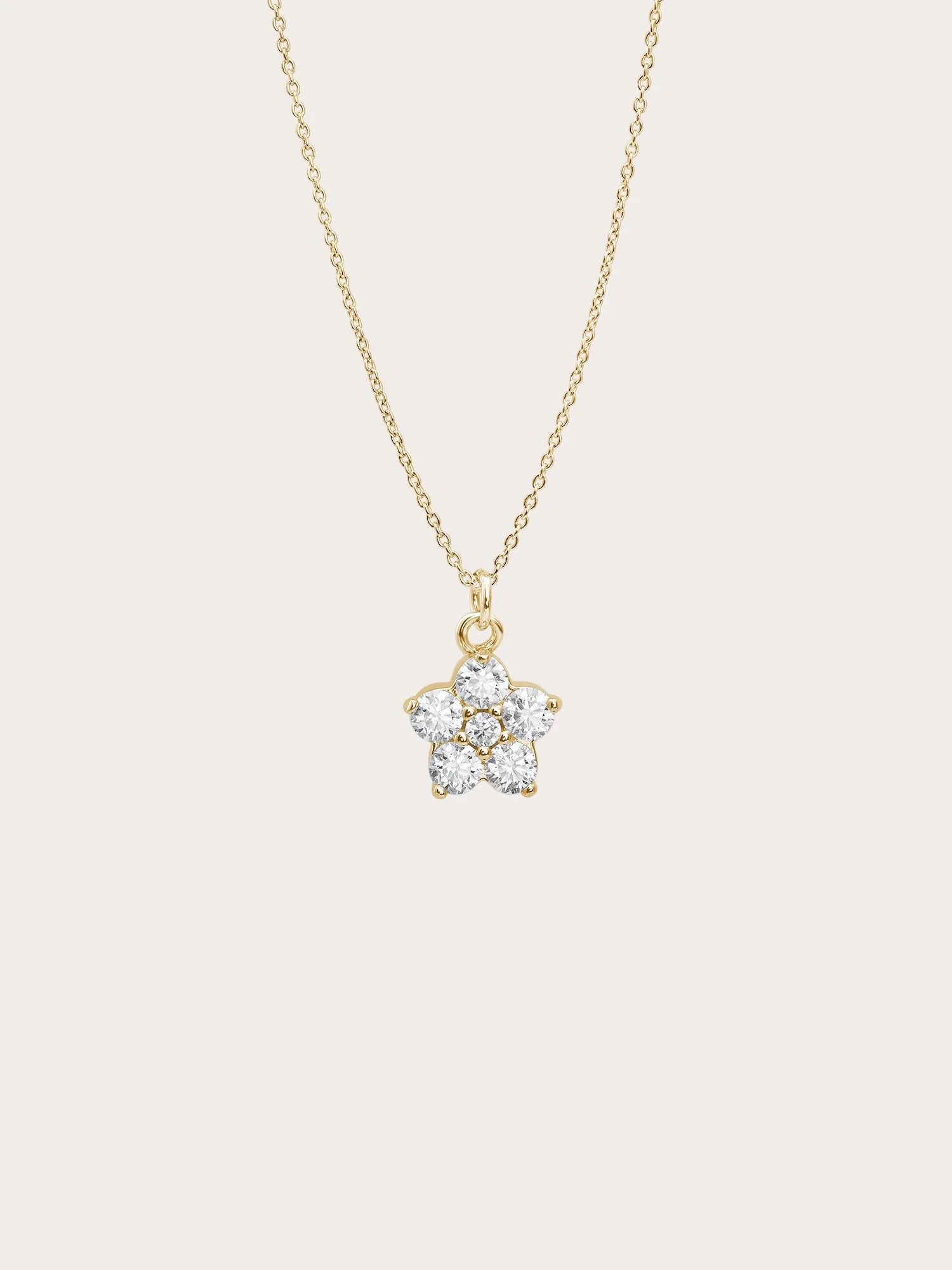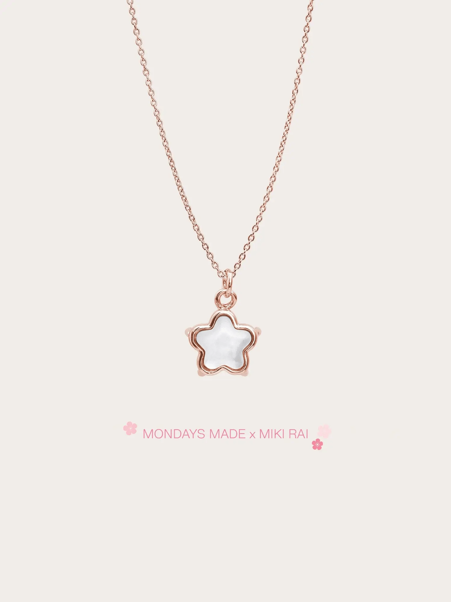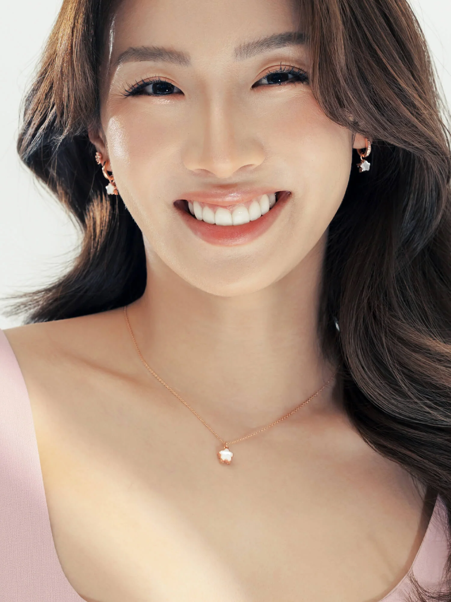 This reversible necklace has a practical two-in-one design. One side presents a finely carved puffy mother-of-pearl cherry blossom, and the other side glistens with radiant moissanites, combining softness and brilliance in one item. It's hand - crafted in 18k rose gold vermeil.
