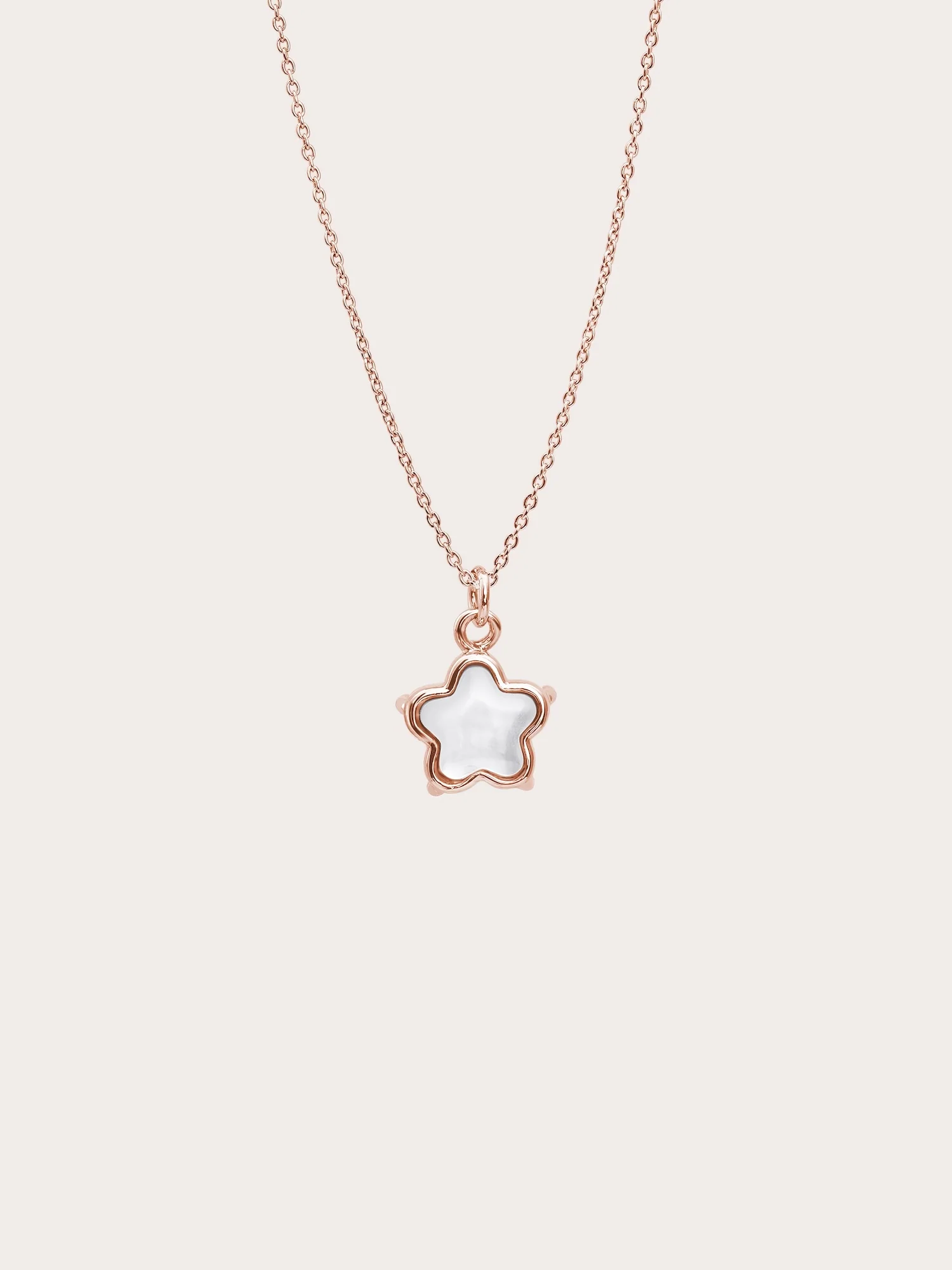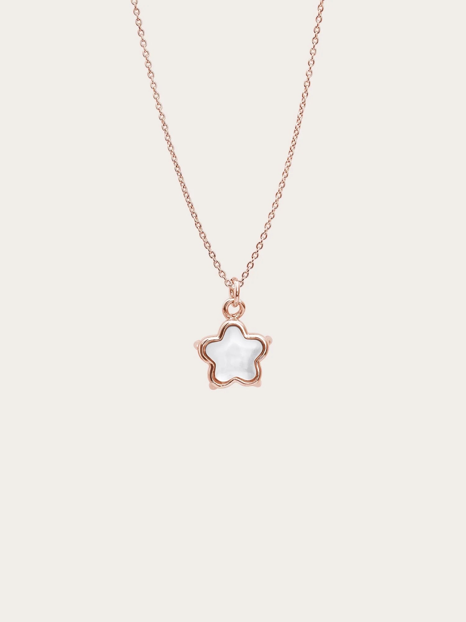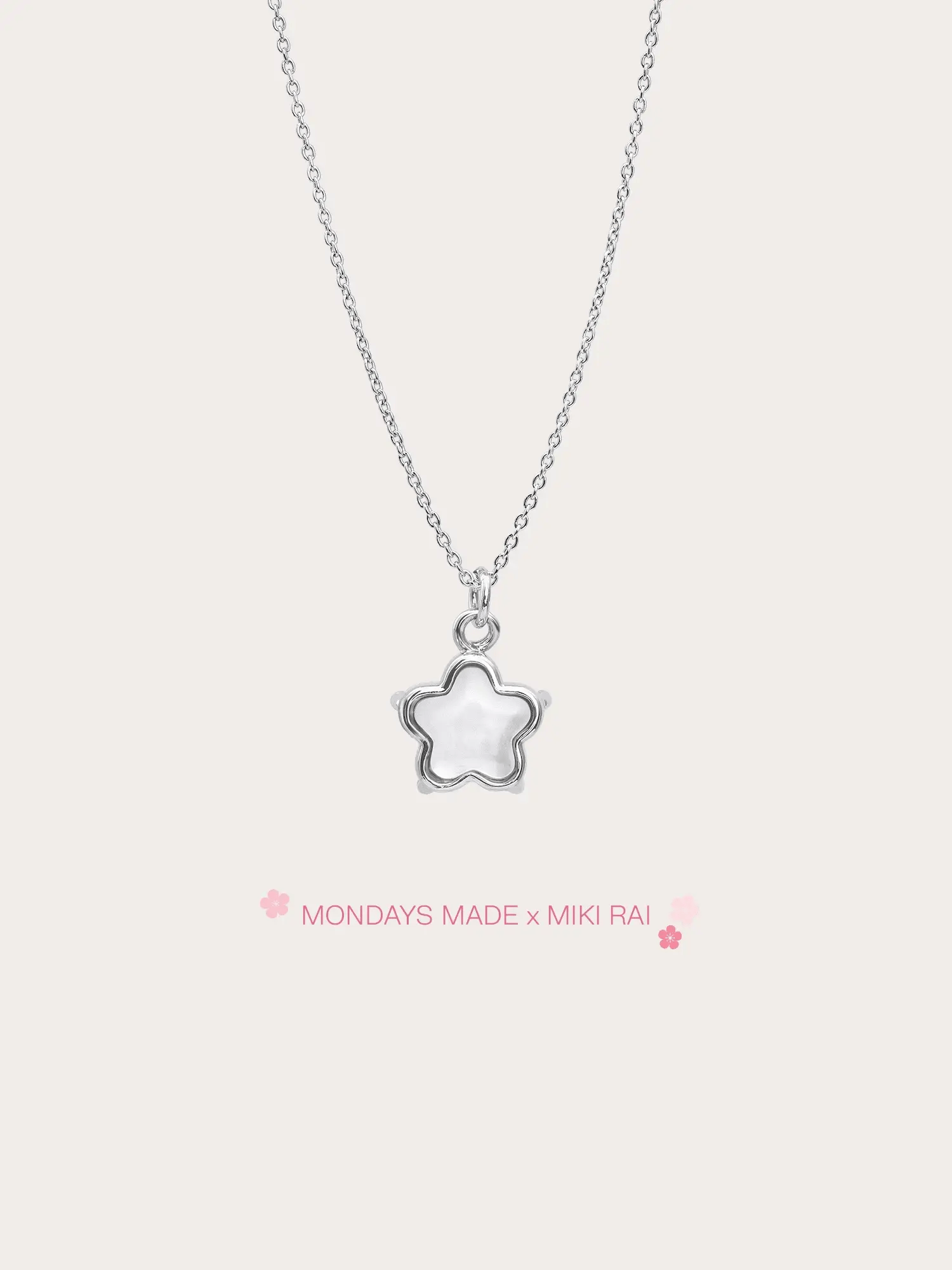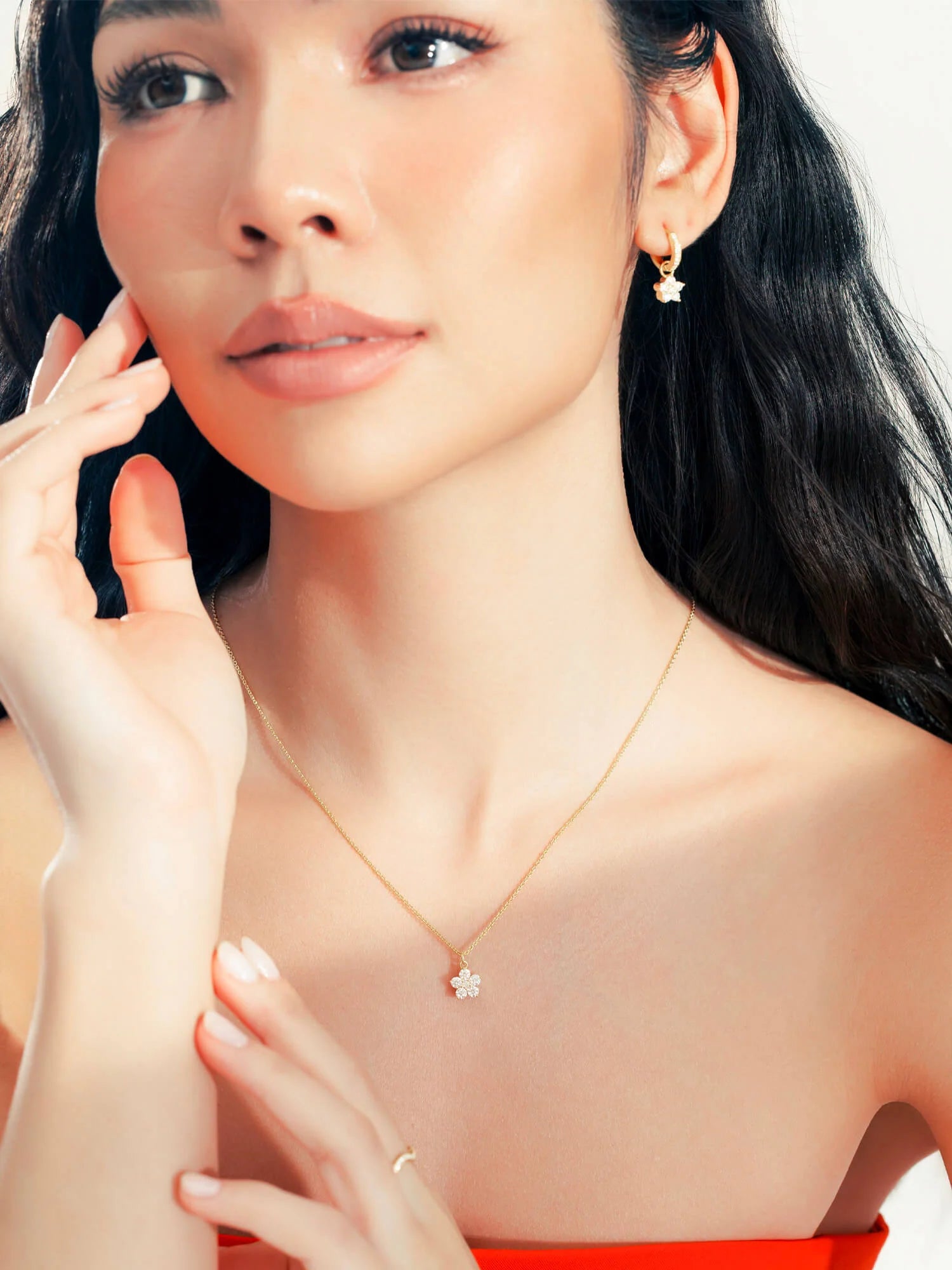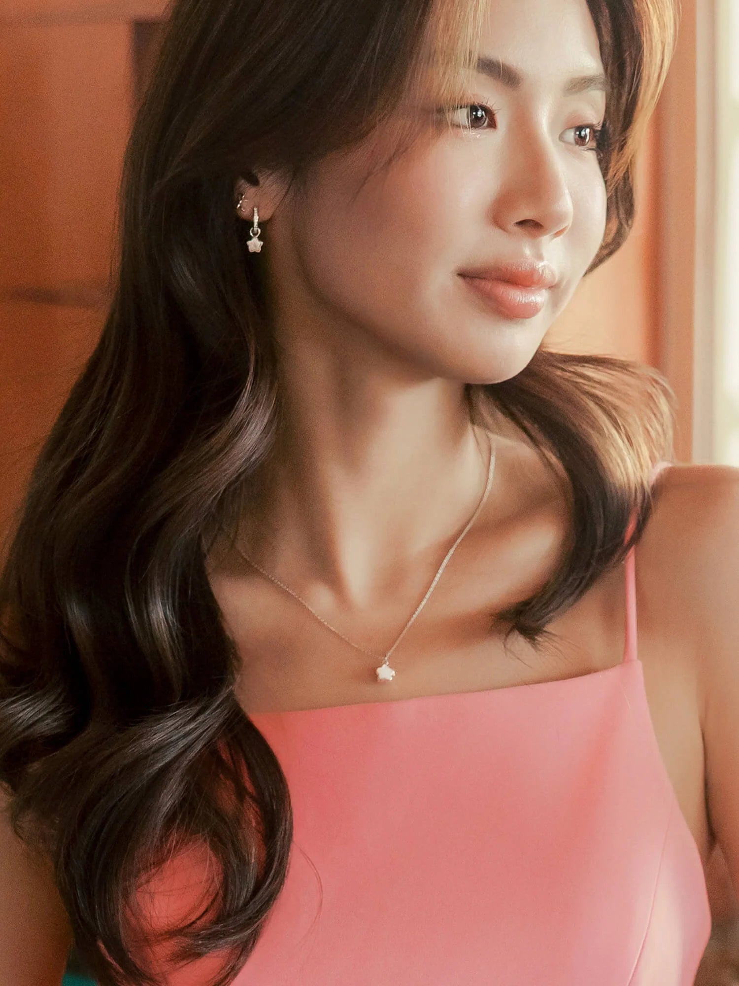 This reversible necklace has a practical two-in-one design. One side presents a finely carved puffy mother-of-pearl cherry blossom, and the other side glistens with radiant moissanites, combining softness and brilliance in one item. It's hand - crafted in 18k rose gold vermeil.