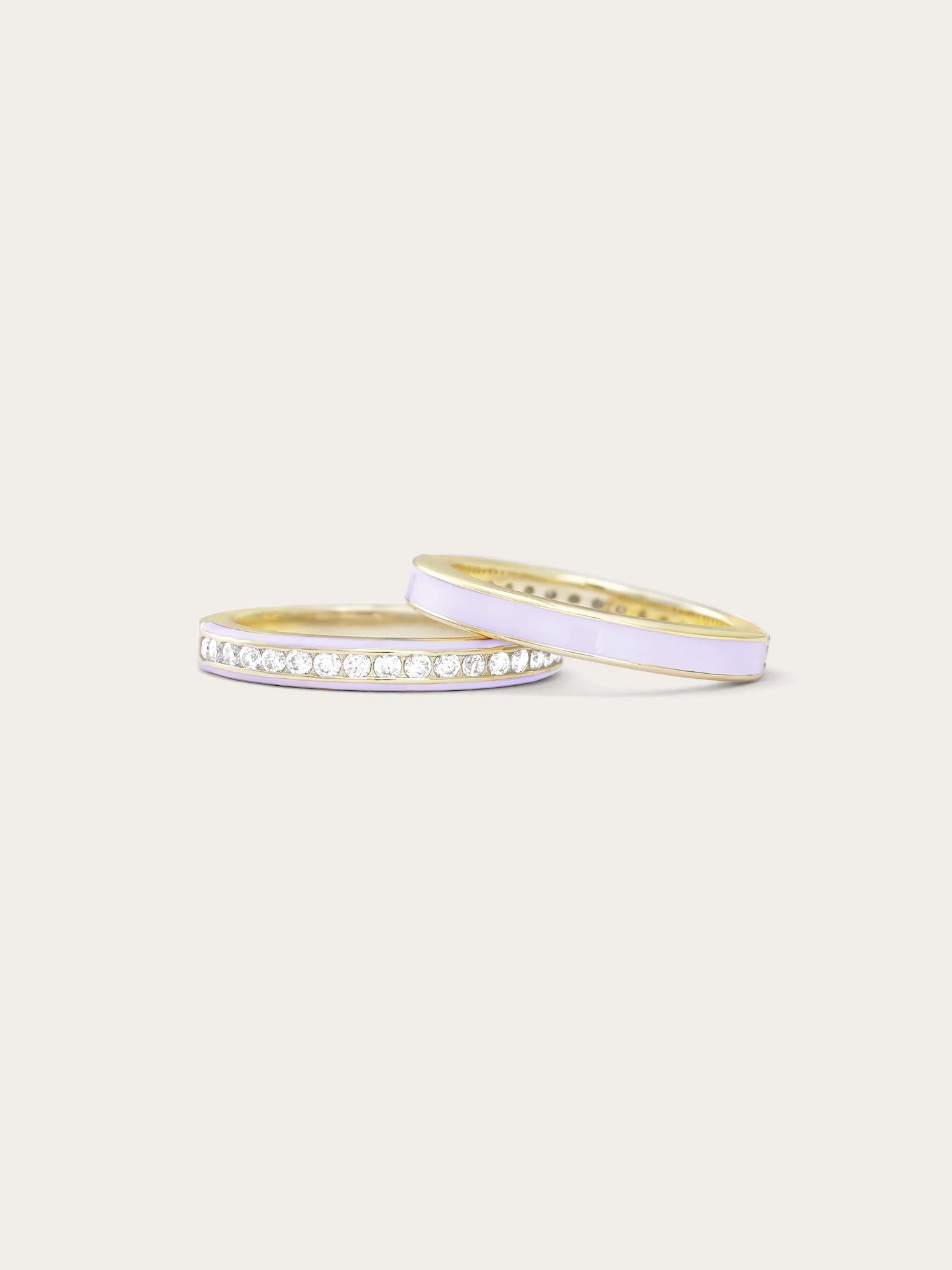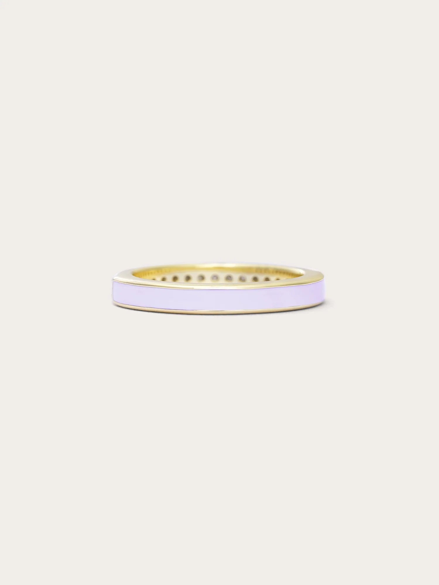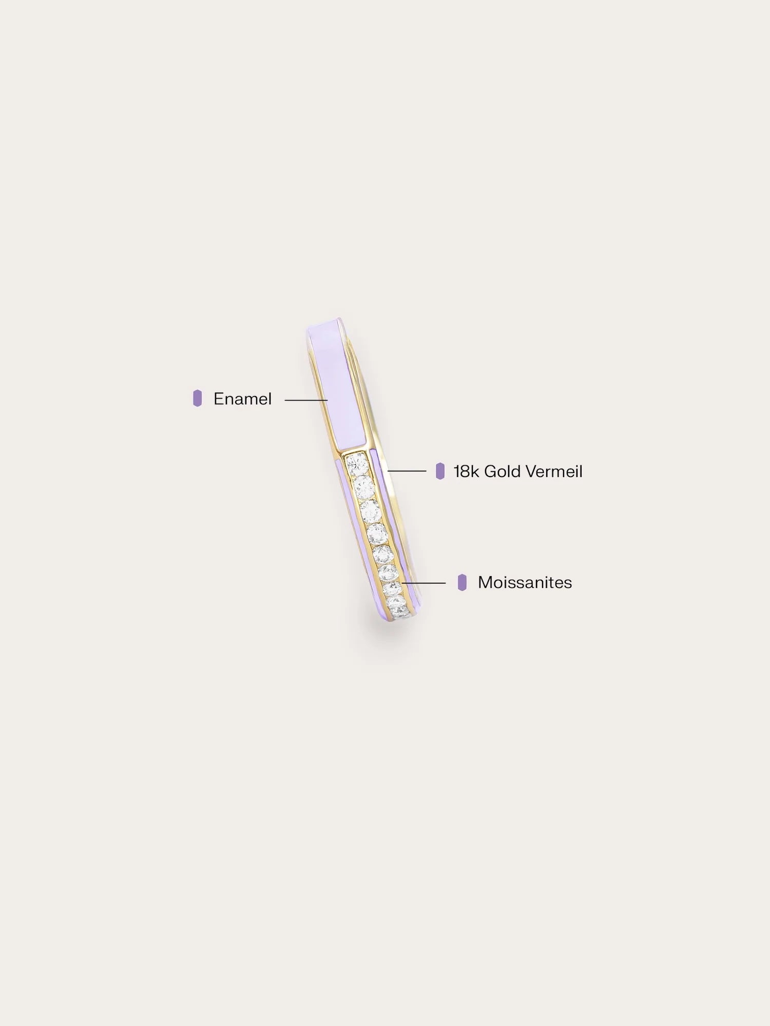 This reversible purple enamel ring offers two styles in one piece. One side has a smooth pastel purple enamel surface, and the other side is adorned with a row of pavé moissanites that sparkle beautifully. It is hand - crafted with 18k gold vermeil.