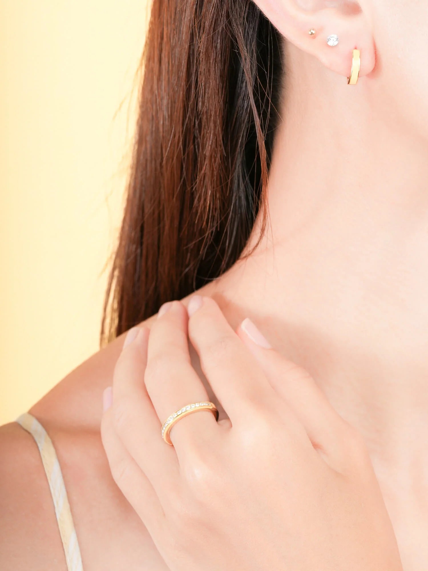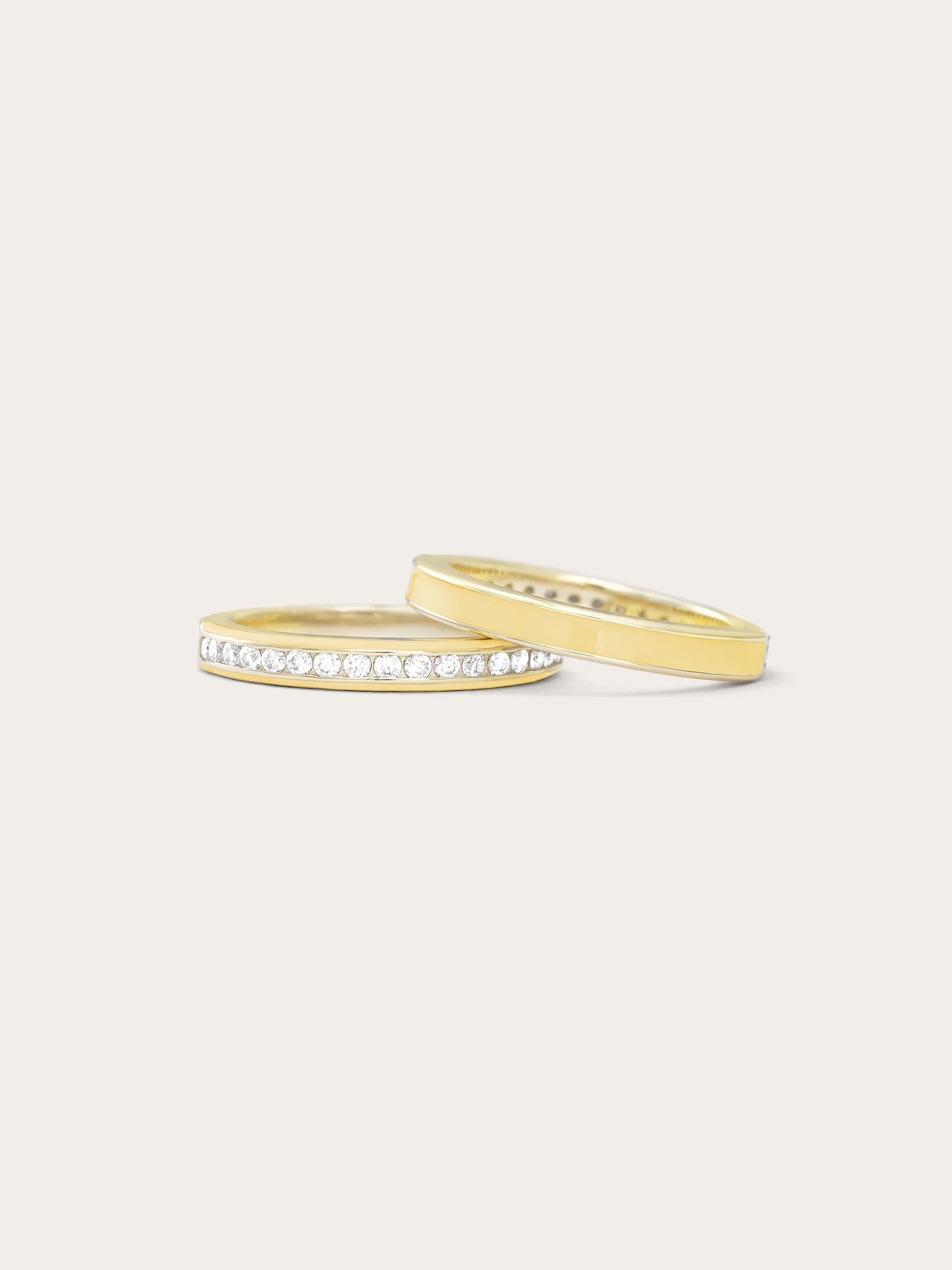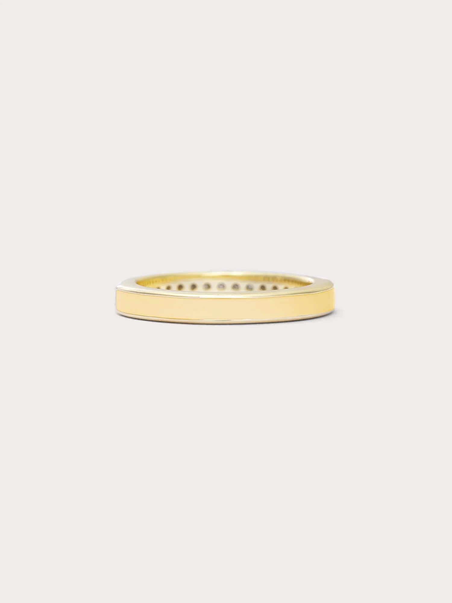 This reversible yellow enamel ring offers two styles in one piece. One side has a smooth pastel yellow enamel surface, and the other side is adorned with a row of pavé moissanites that sparkle brightly. It is hand - crafted using a silver base with an 18k gold plating.