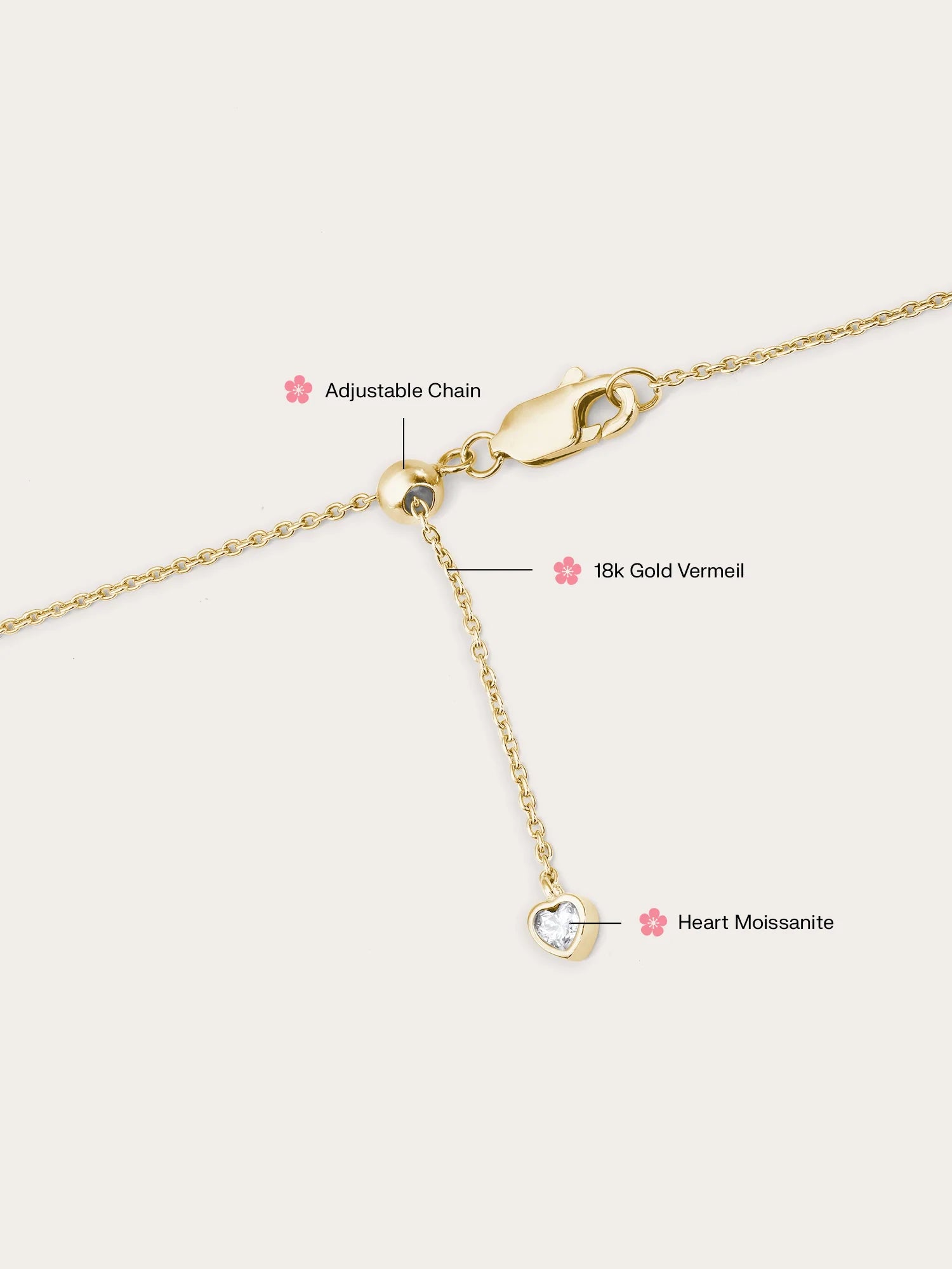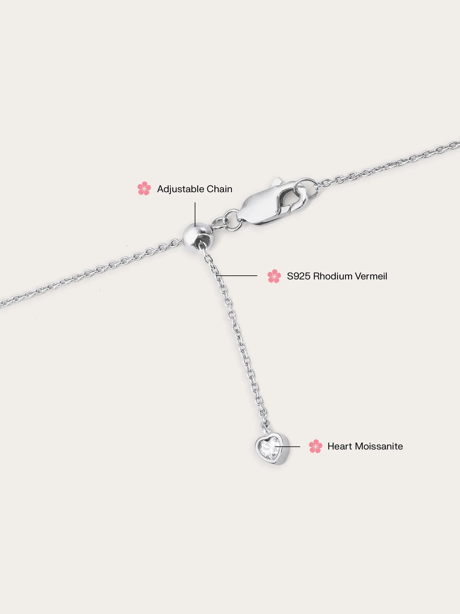 Adjustable Length: The necklace is easily adjustable to different lengths up to 42cm, and features a heart moissanite at the end for a touch of sparkle (a Mondays Made x Miki Rai collection exclusive). See how it looks here at different lengths.