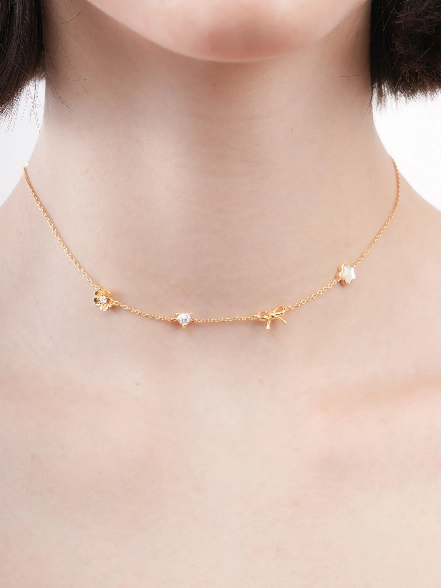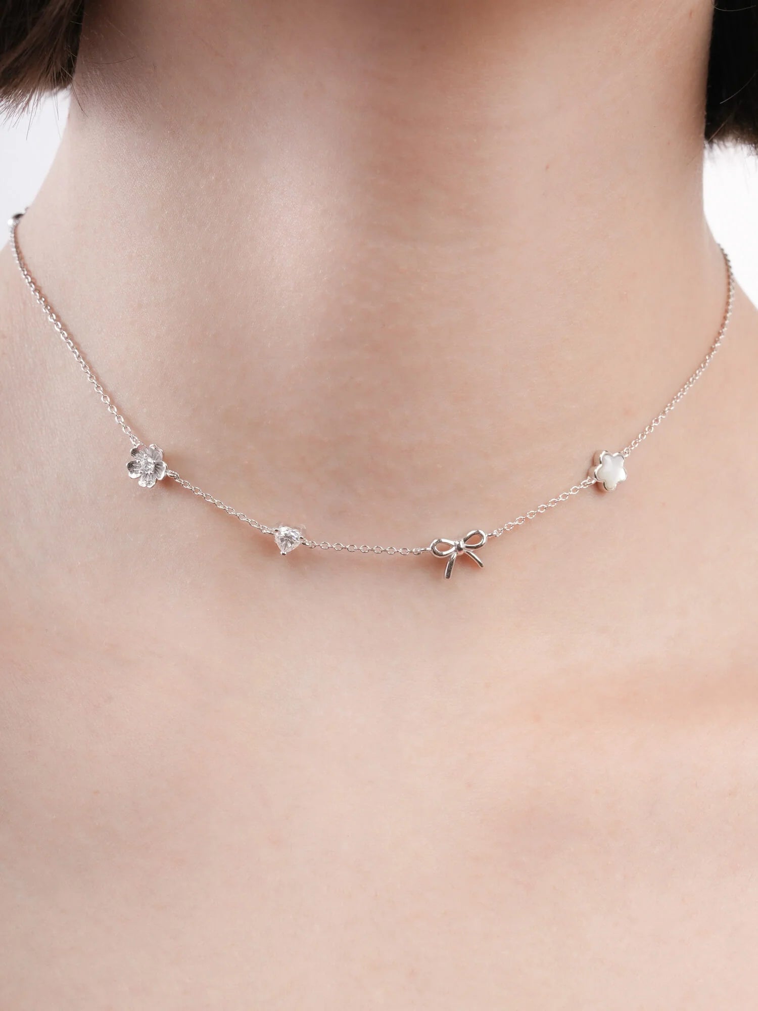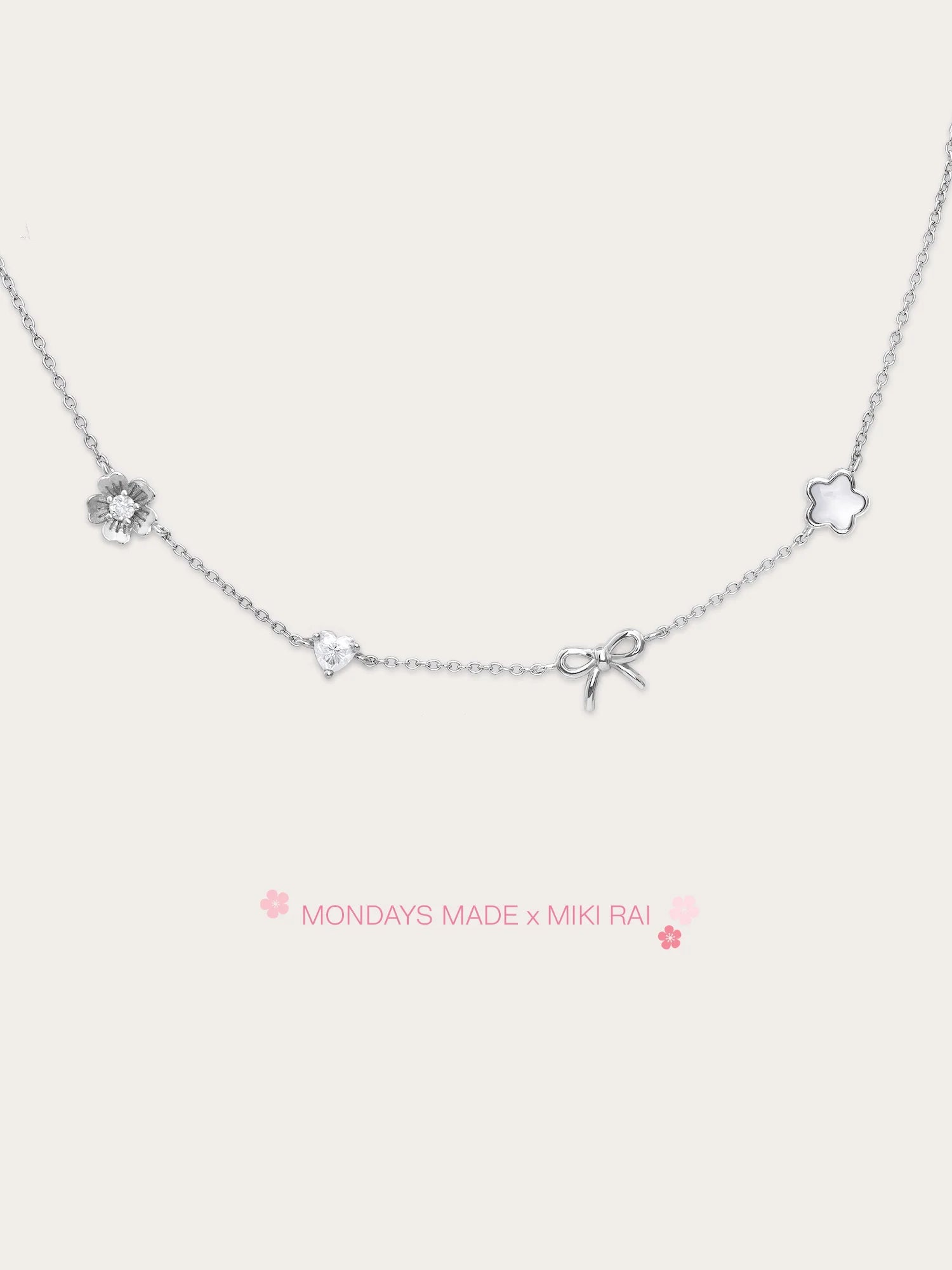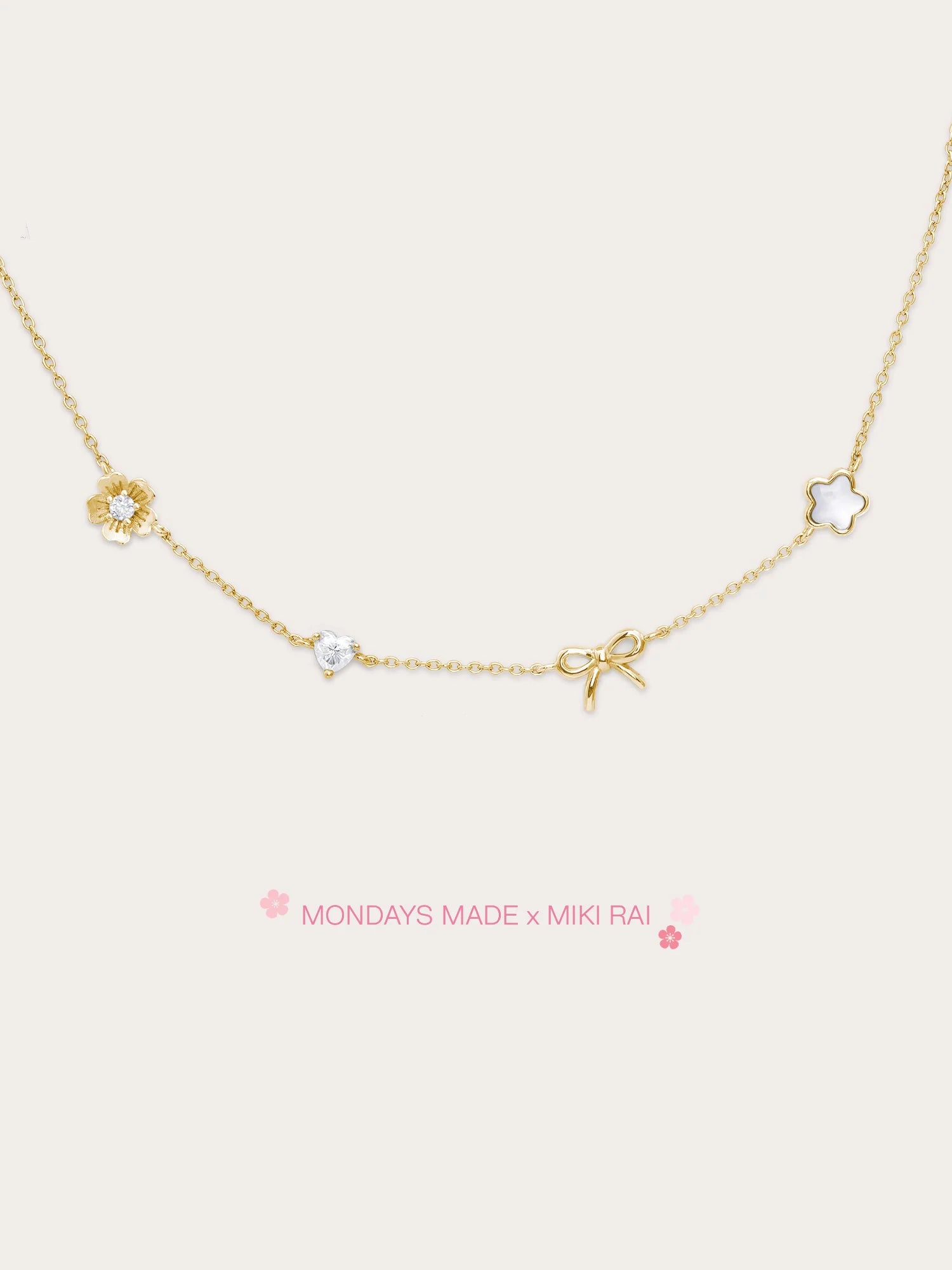 The Rise & Shine Charm Necklace features meaningful motifs close to Miki’s heart: a dainty sakura, a sparkling moissanite heart, a graceful ribbon bow, and a luminous puffy mother of pearl sakura.