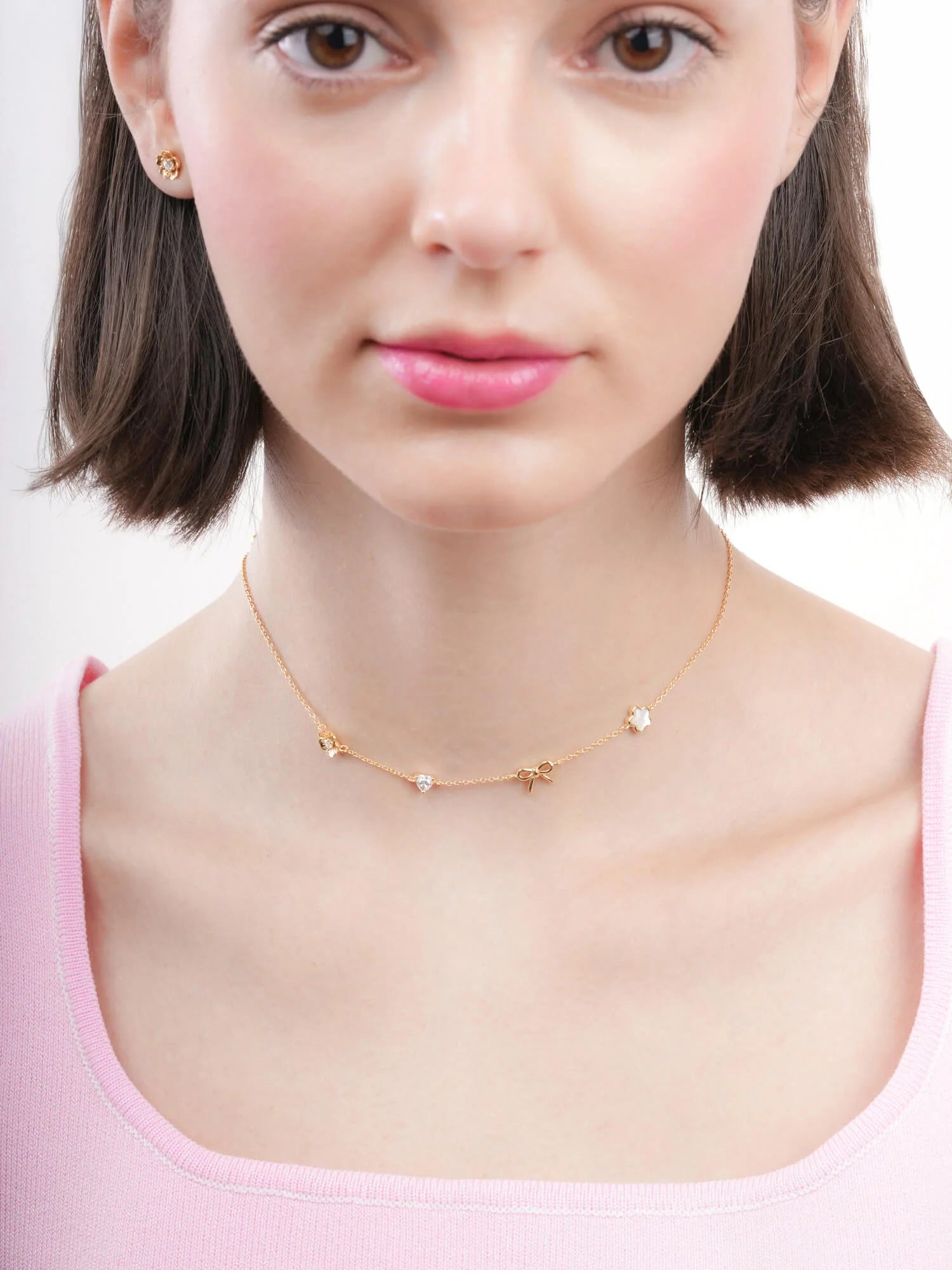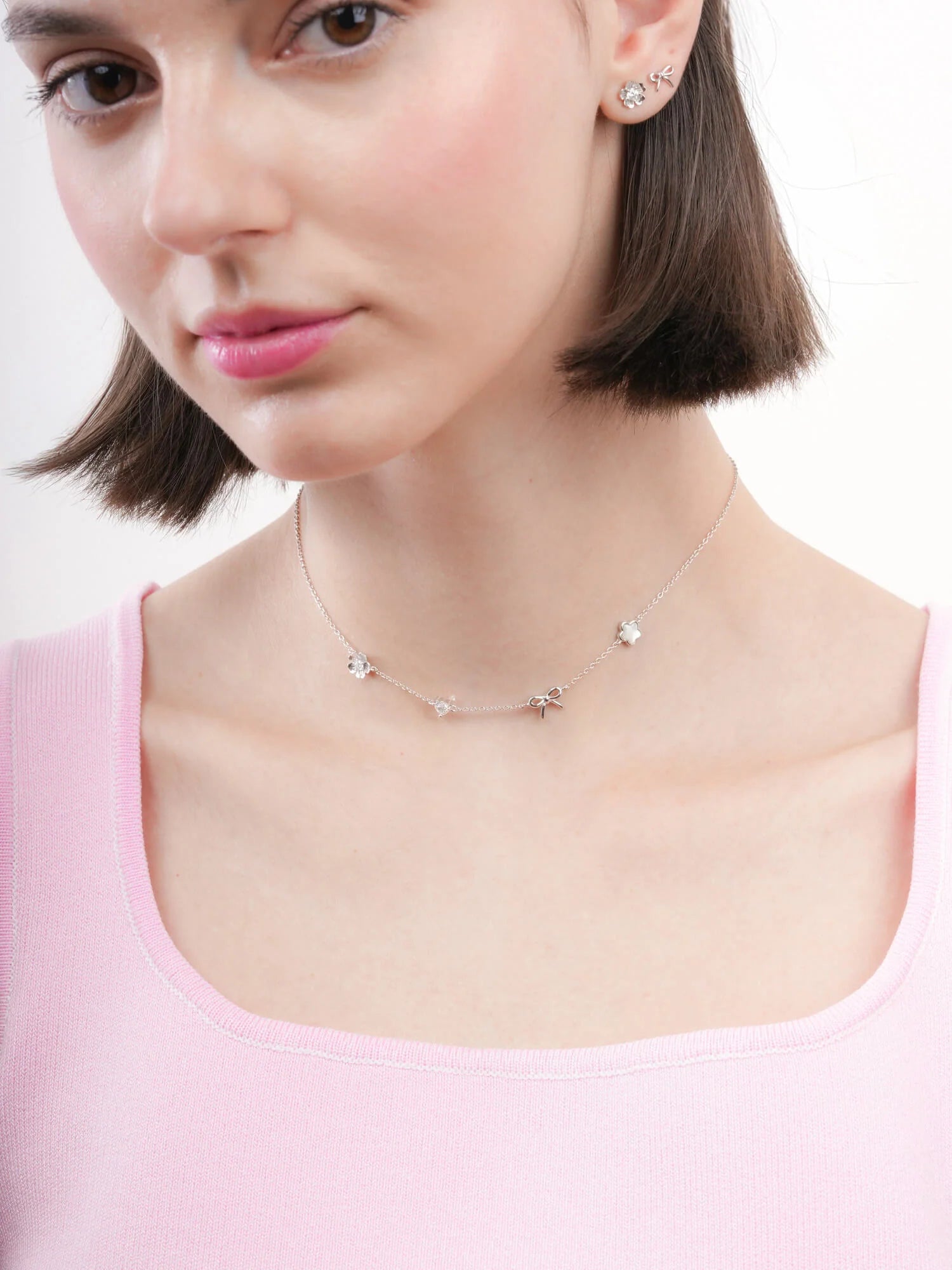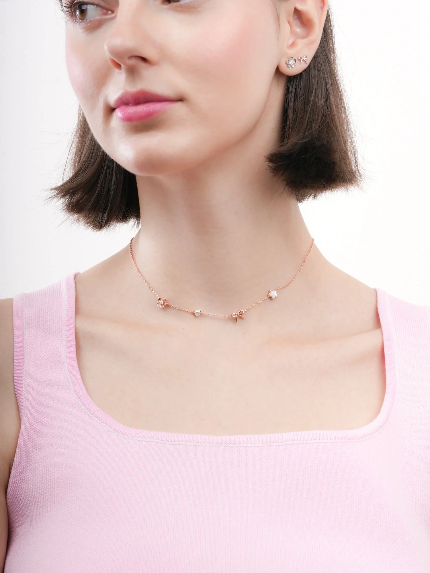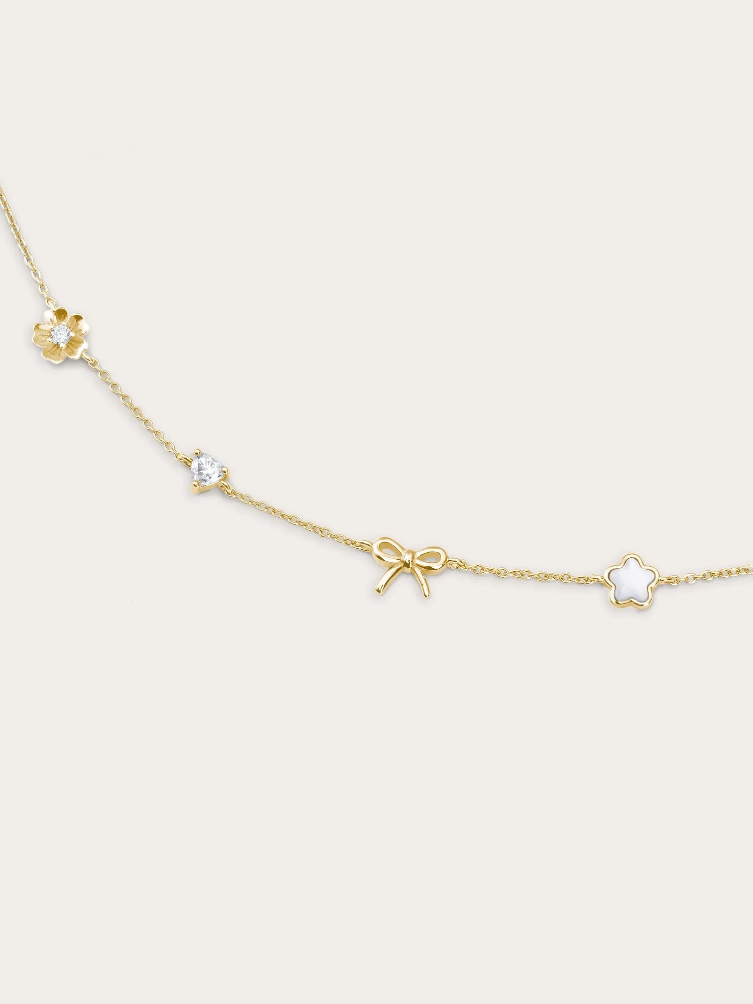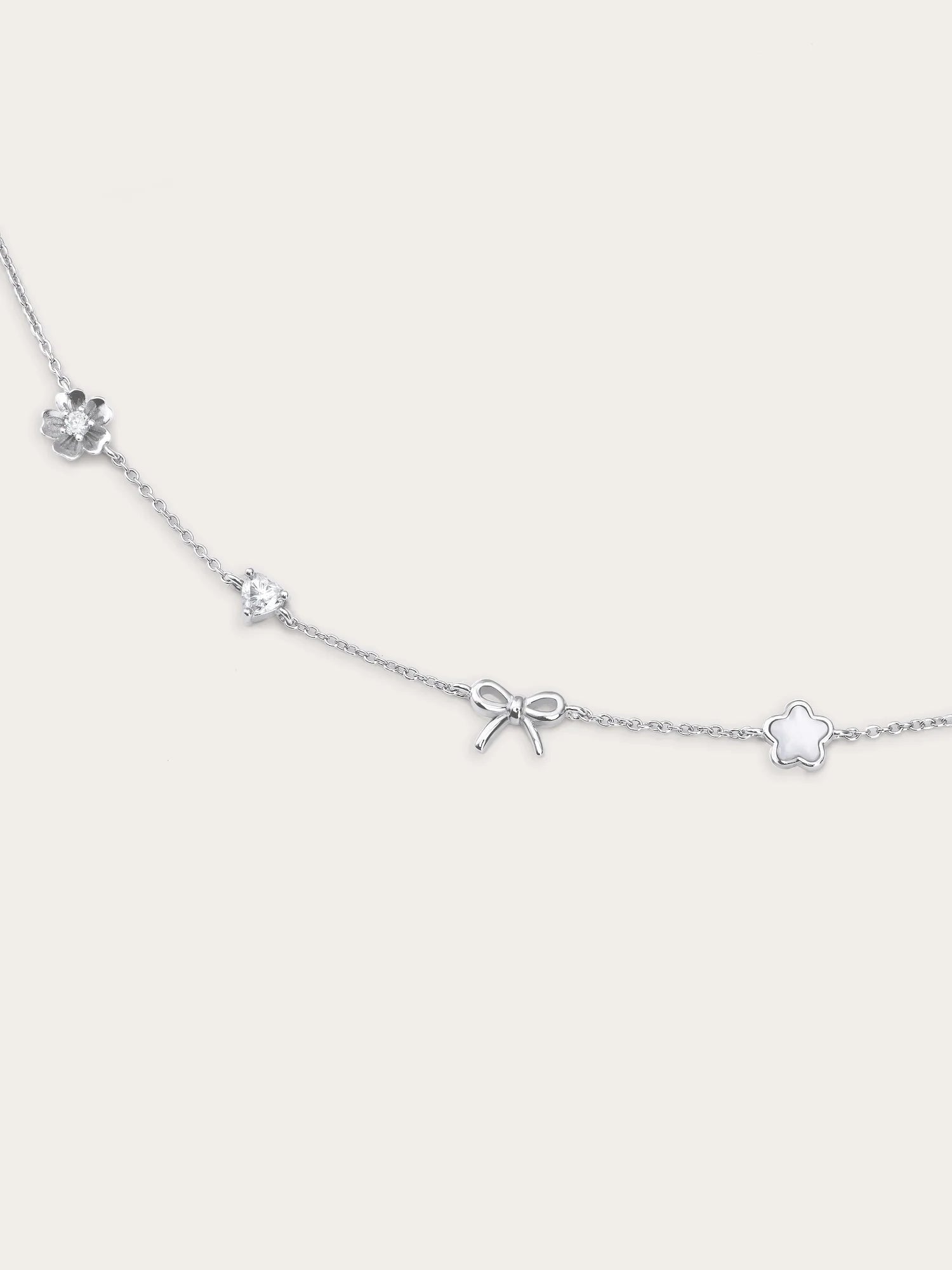 The Rise & Shine Charm Necklace features meaningful motifs close to Miki’s heart: a dainty sakura, a sparkling moissanite heart, a graceful ribbon bow, and a luminous puffy mother of pearl sakura.