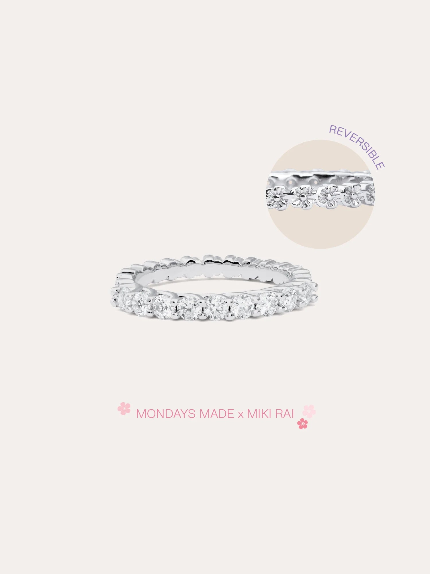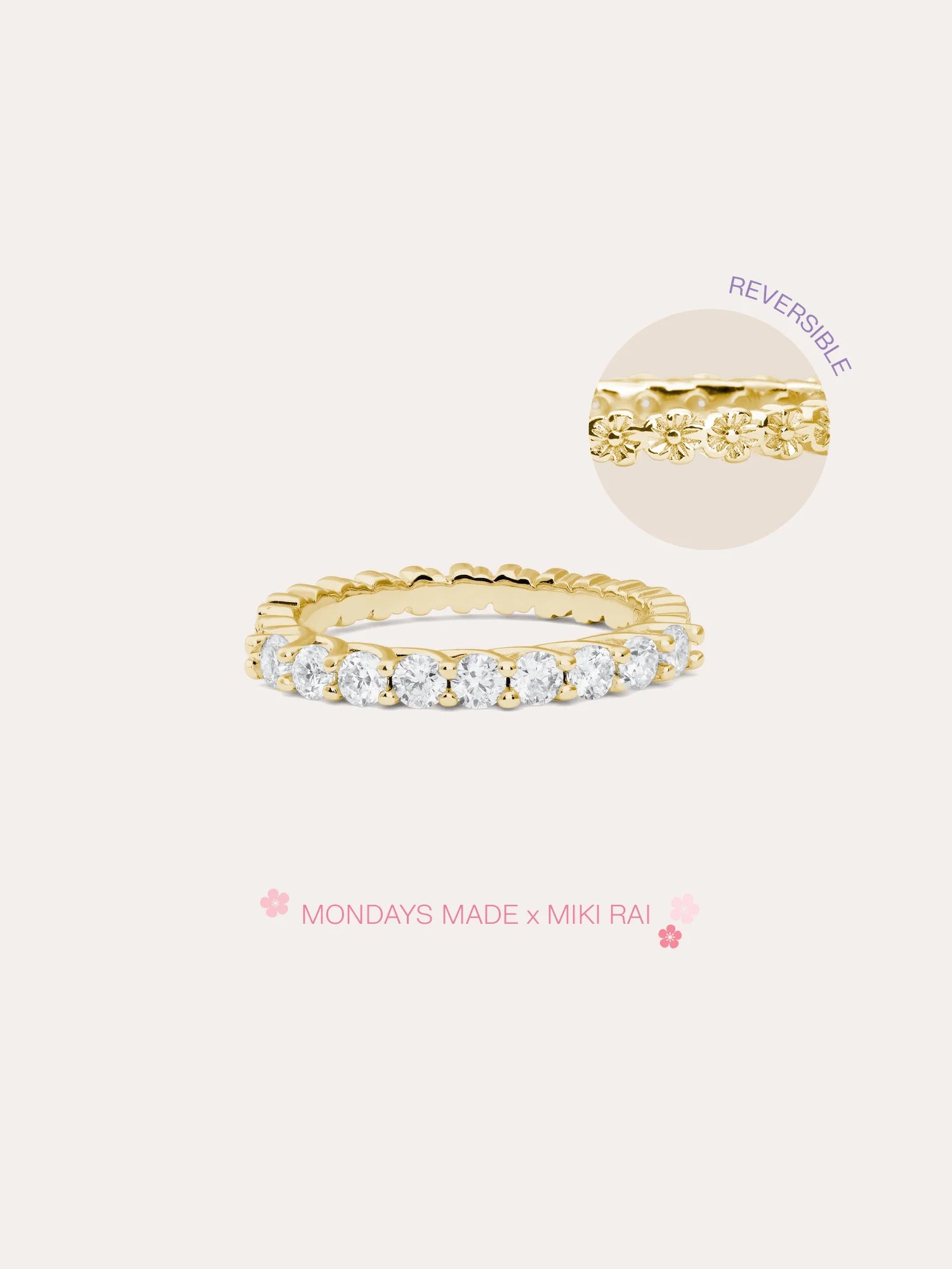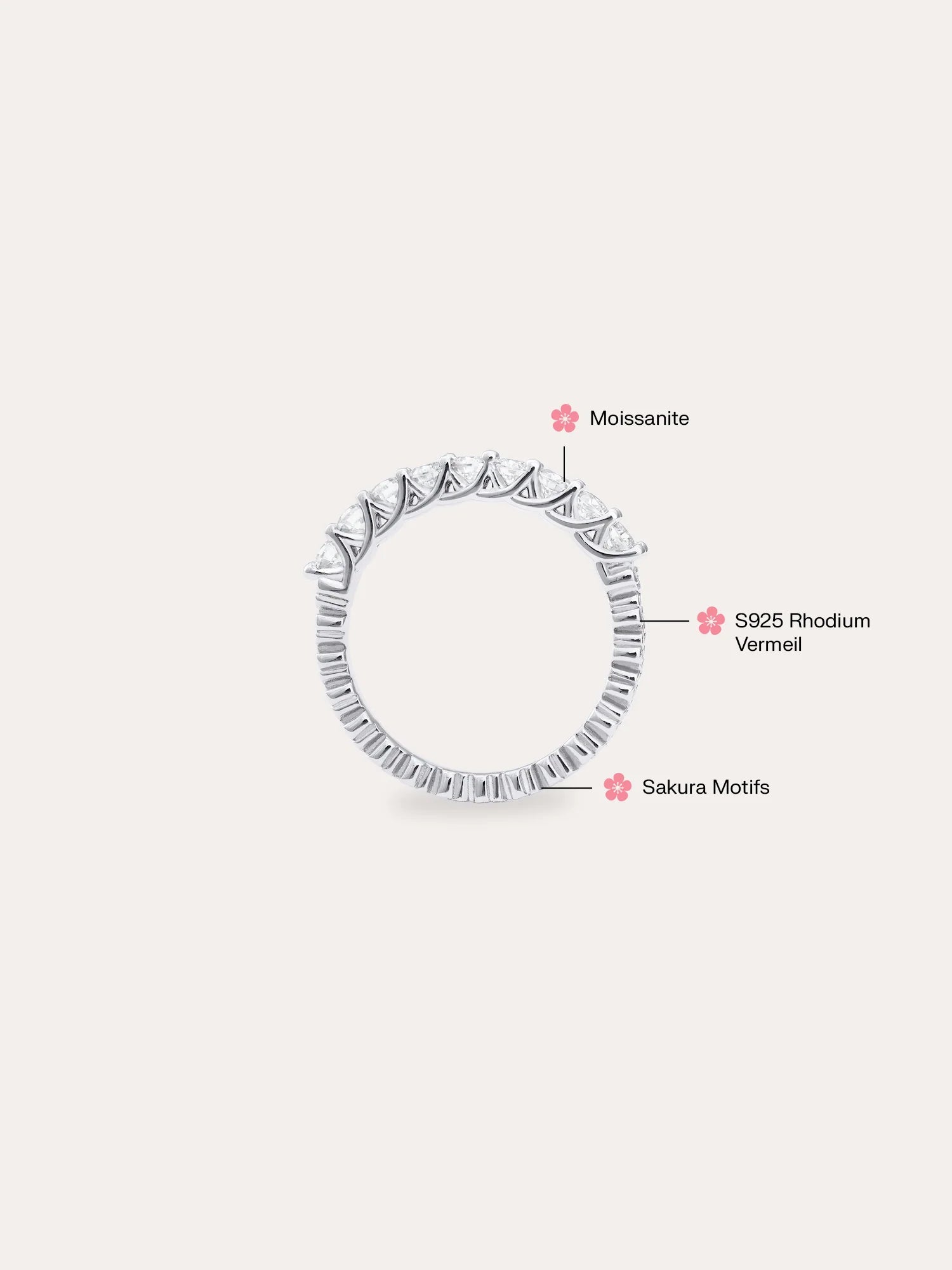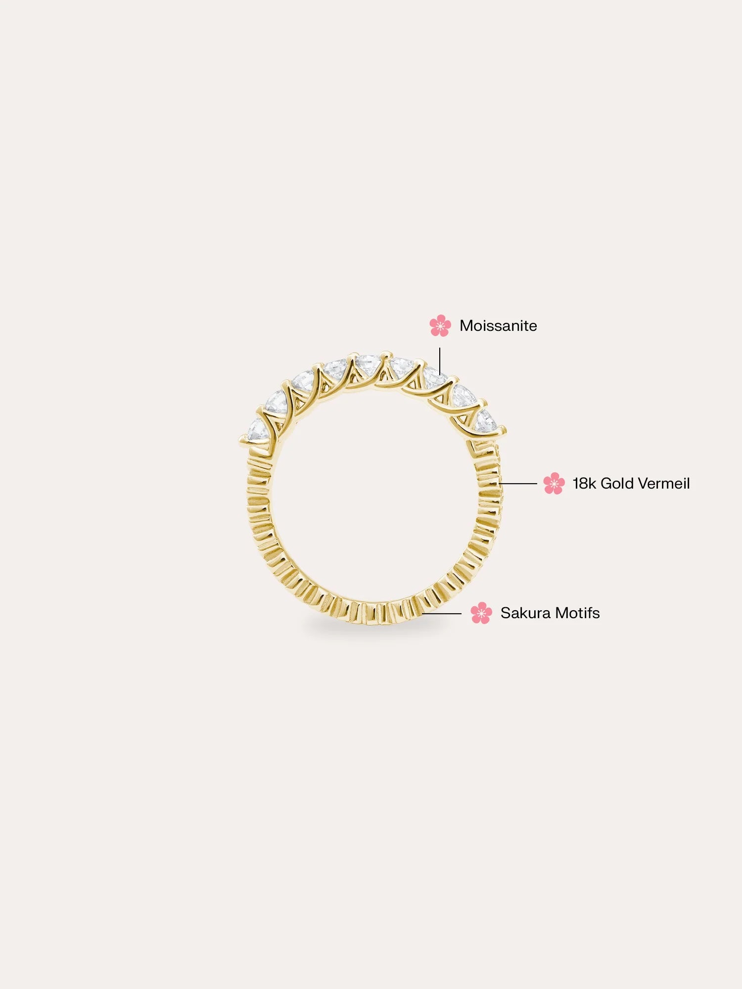 The Sakura Moissanite Eternity Band features a versatile two-in-one design - one side lined with moissanites for a clean, timeless sparkle, and the other adorned with dainty sakura motifs for a soft, feminine touch. Handcrafted in 18k gold vermeil.