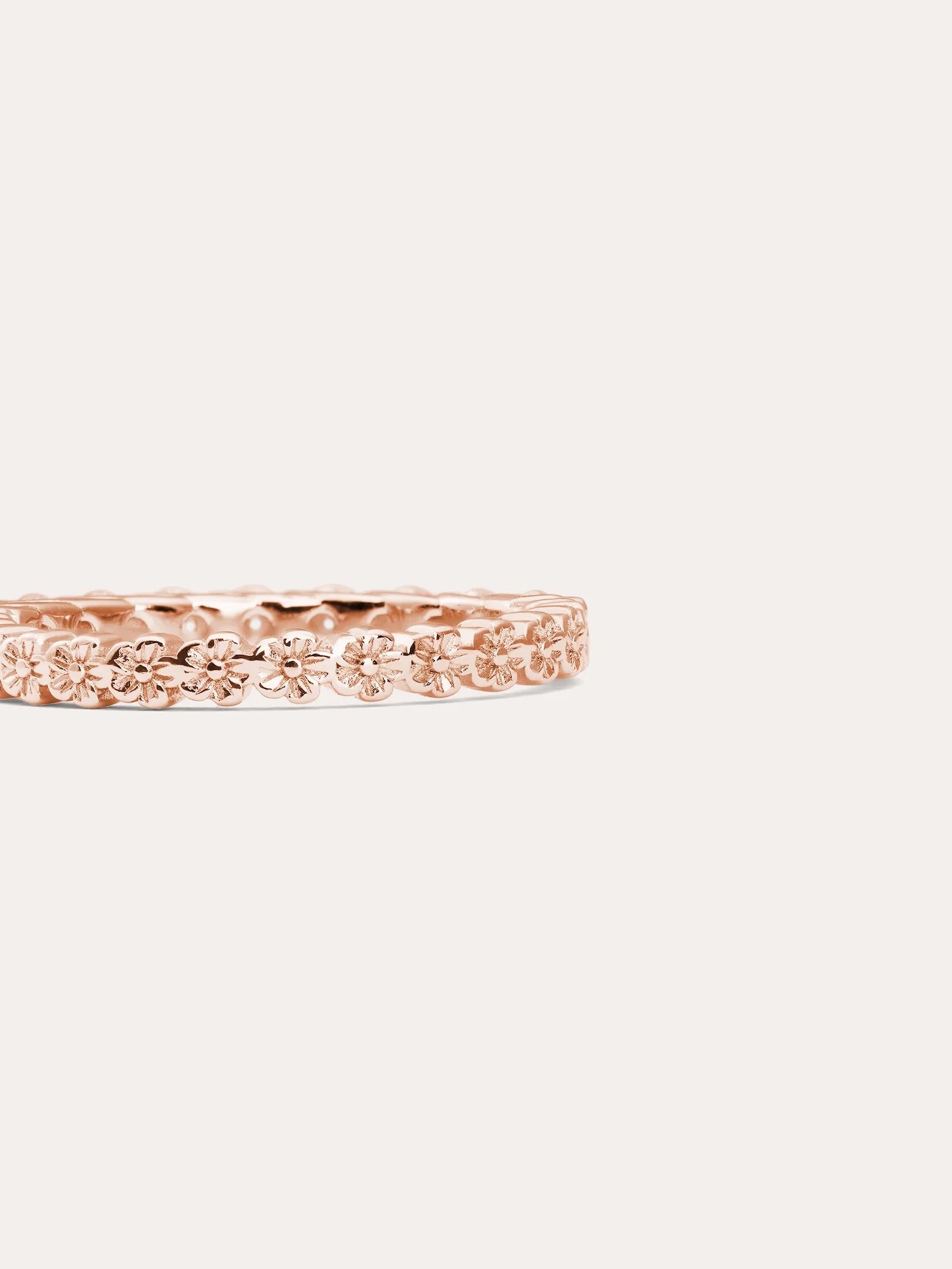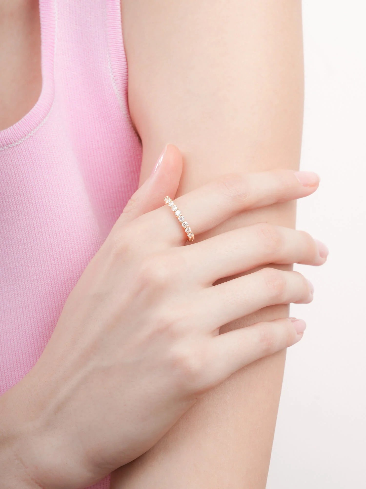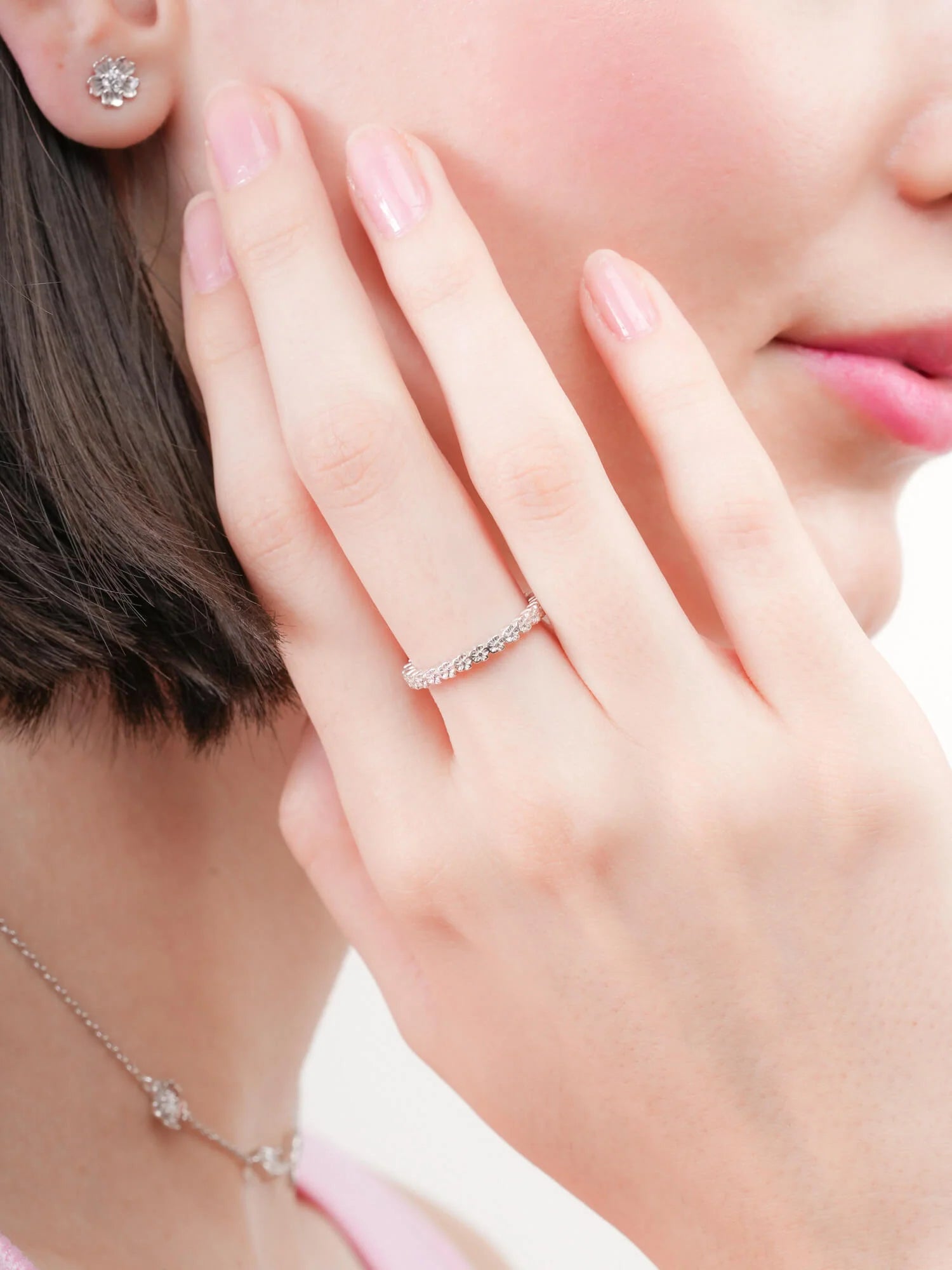 The Sakura Moissanite Eternity Band features a versatile two-in-one design - one side lined with moissanites for a clean, timeless sparkle, and the other adorned with dainty sakura motifs for a soft, feminine touch. Handcrafted in 18k gold vermeil.