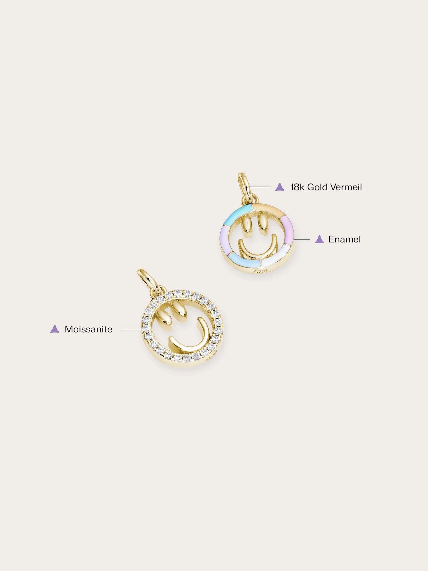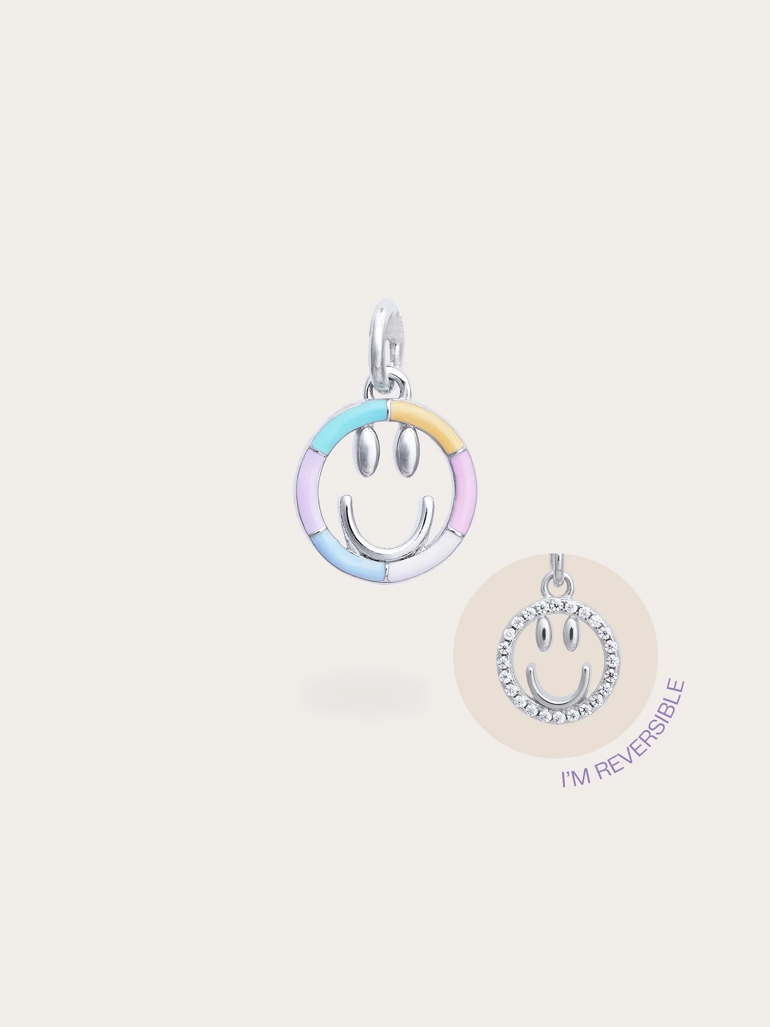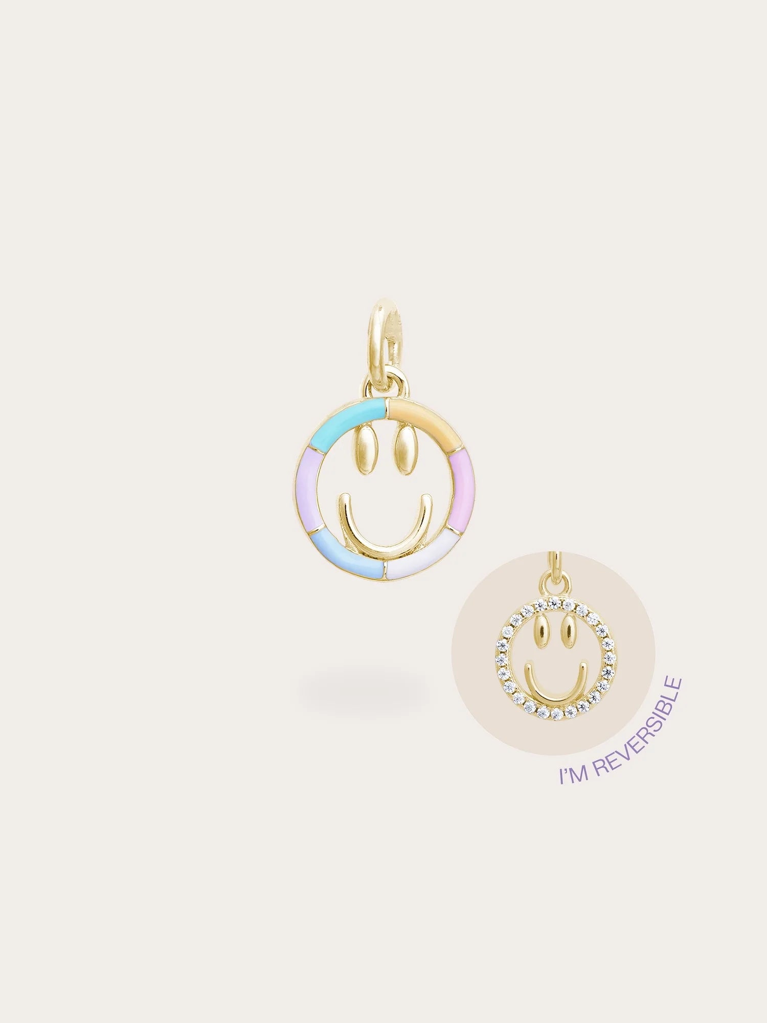 Add a touch of cheer to your daily life with this smiley face charm. This reversible enamel pendant features two sides: one side showcases a hand - painted rainbow enamel smiley face in six lively colors, while the other side is adorned with sparkling pavé moissanites for a timeless shine. It is hand - crafted with a gold - plated finish.