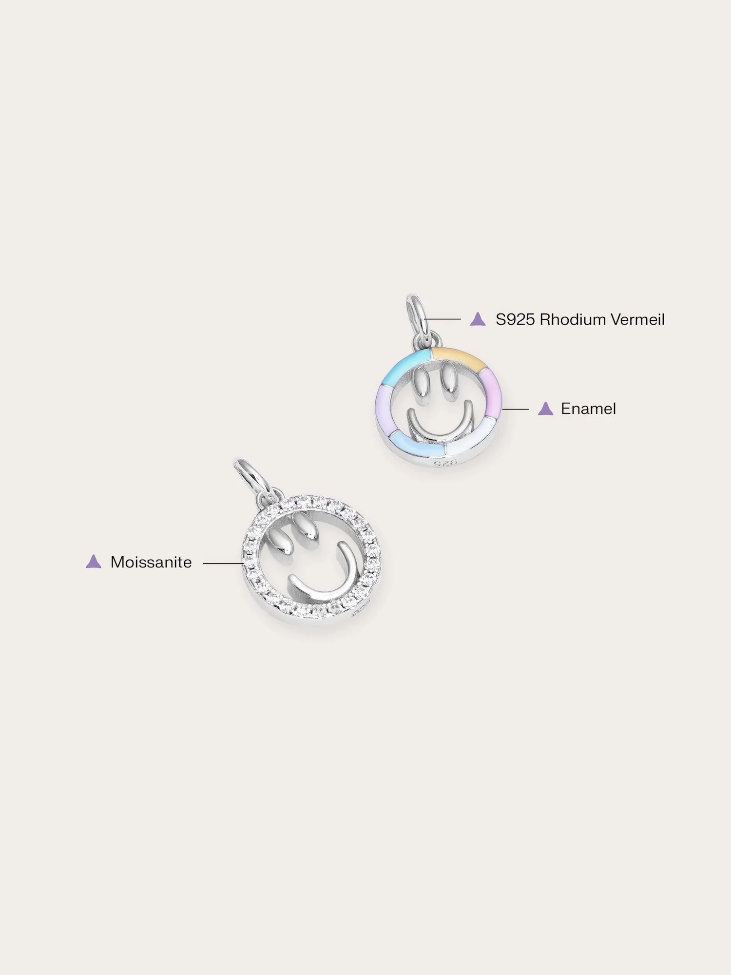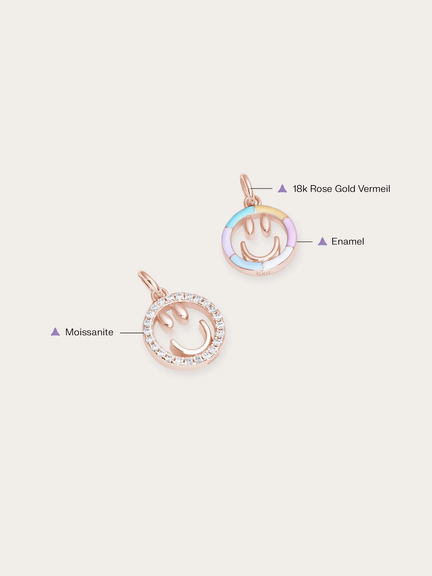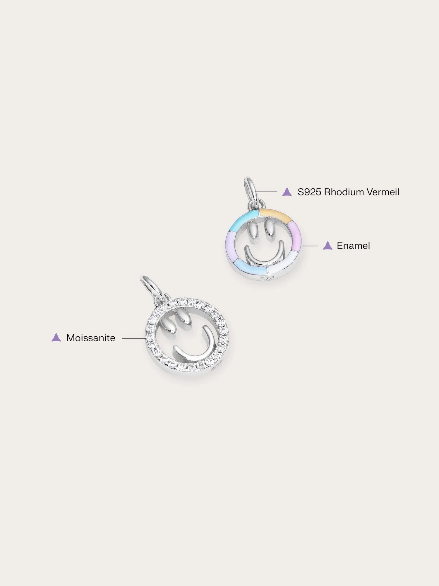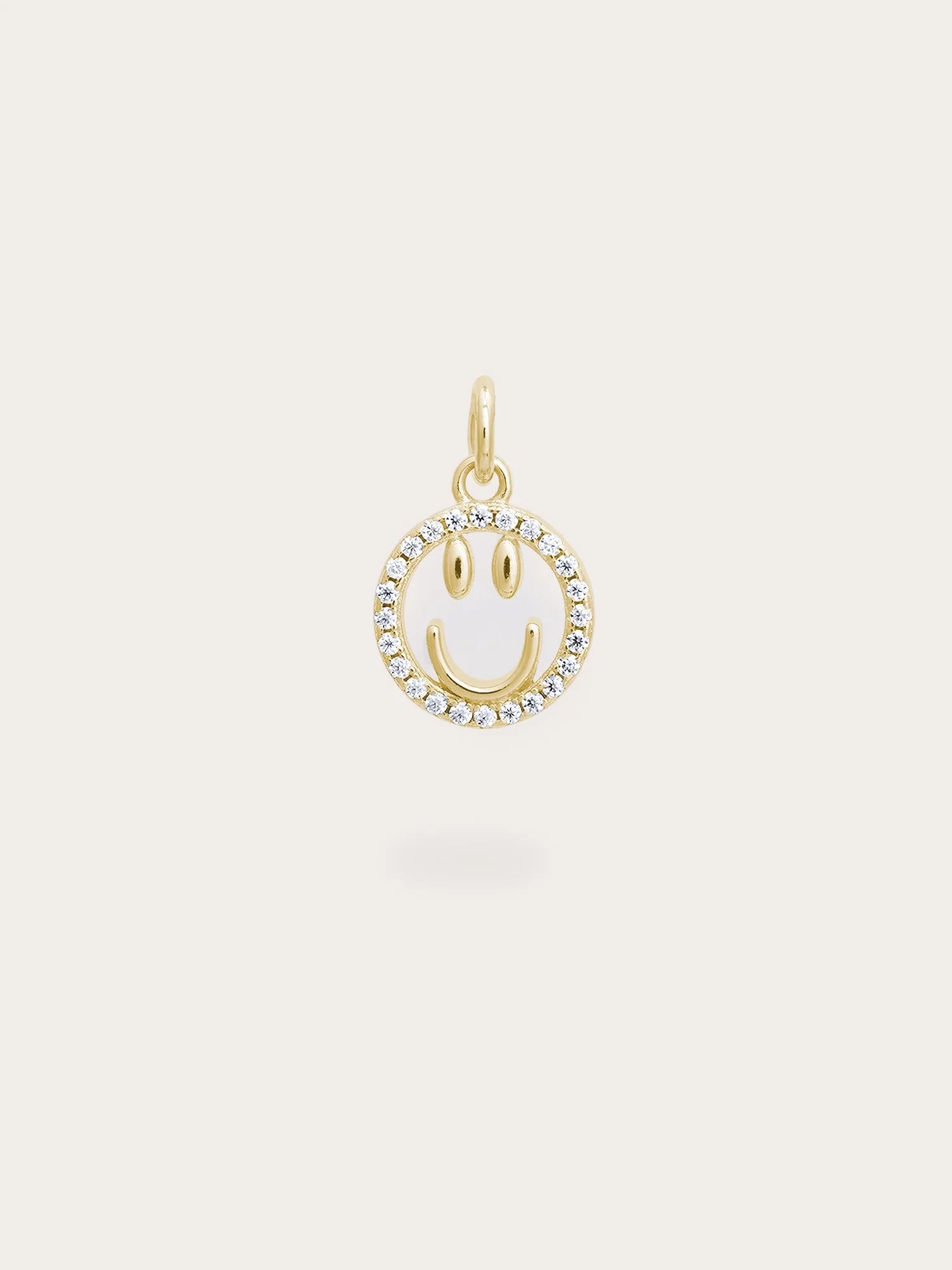 Add a touch of cheer to your daily life with this smiley face charm. This reversible enamel pendant features two sides: one side showcases a hand - painted rainbow enamel smiley face in six lively colors, while the other side is adorned with sparkling pavé moissanites for a timeless shine. It is hand - crafted with a gold - plated finish.
