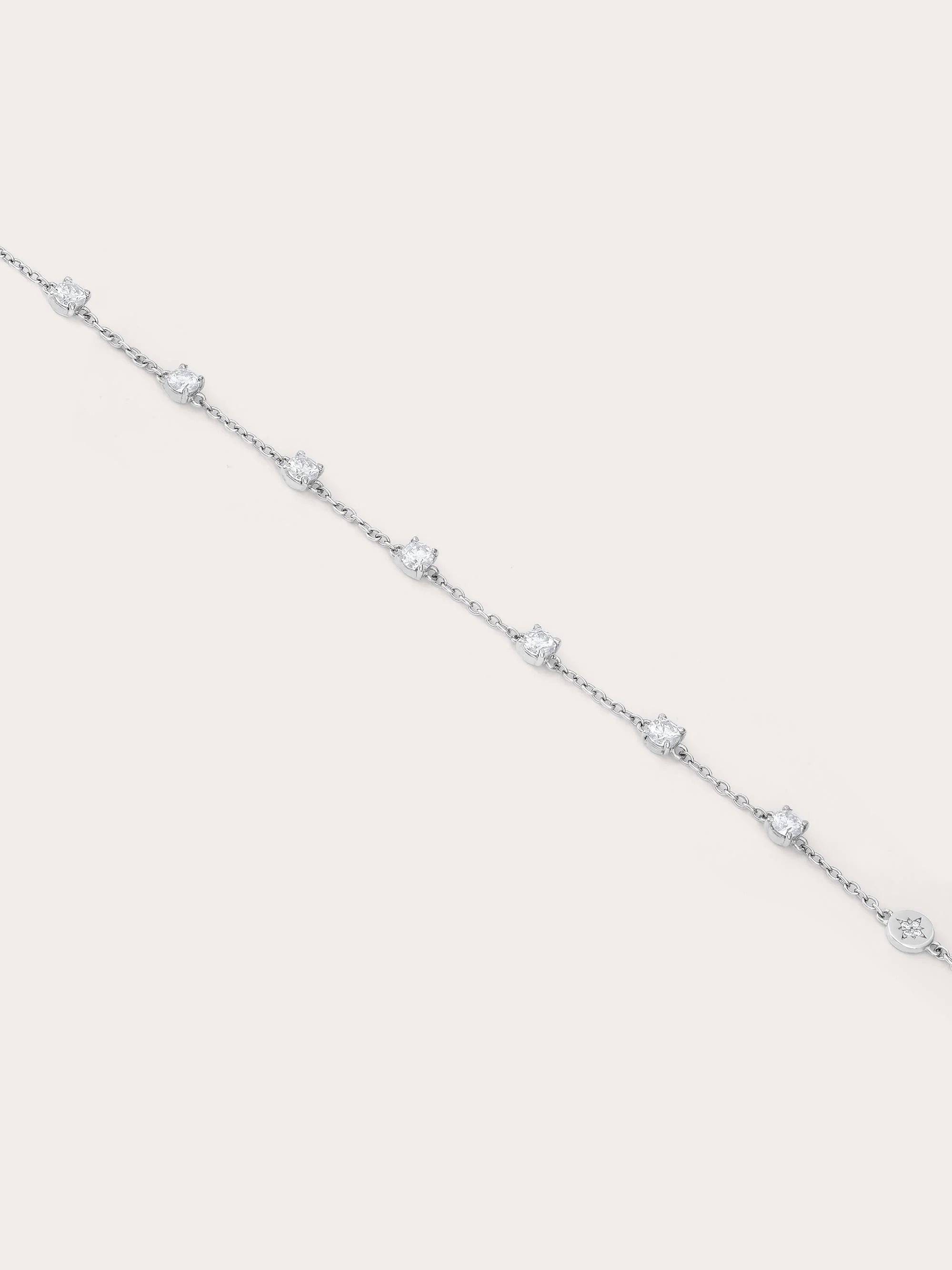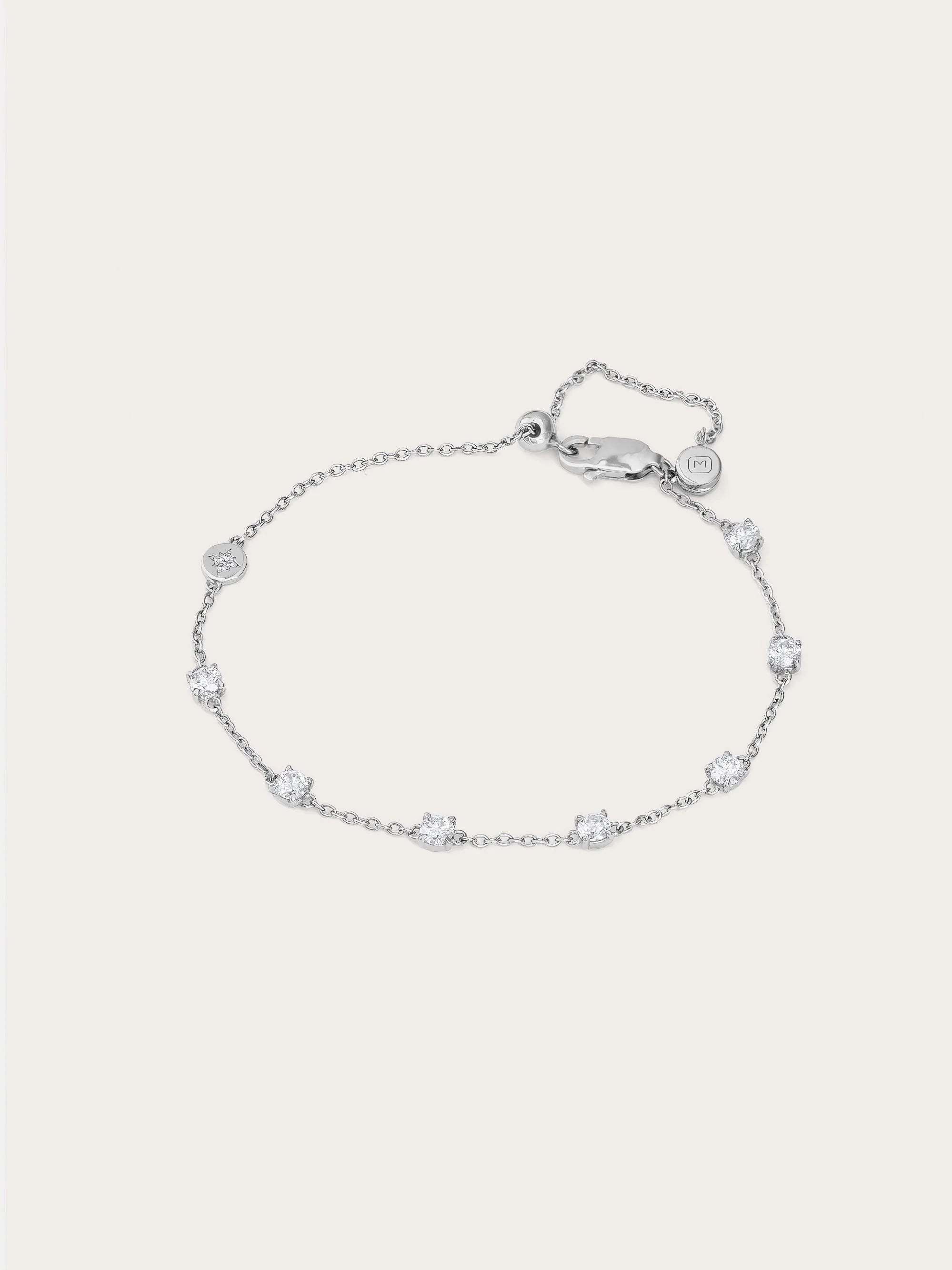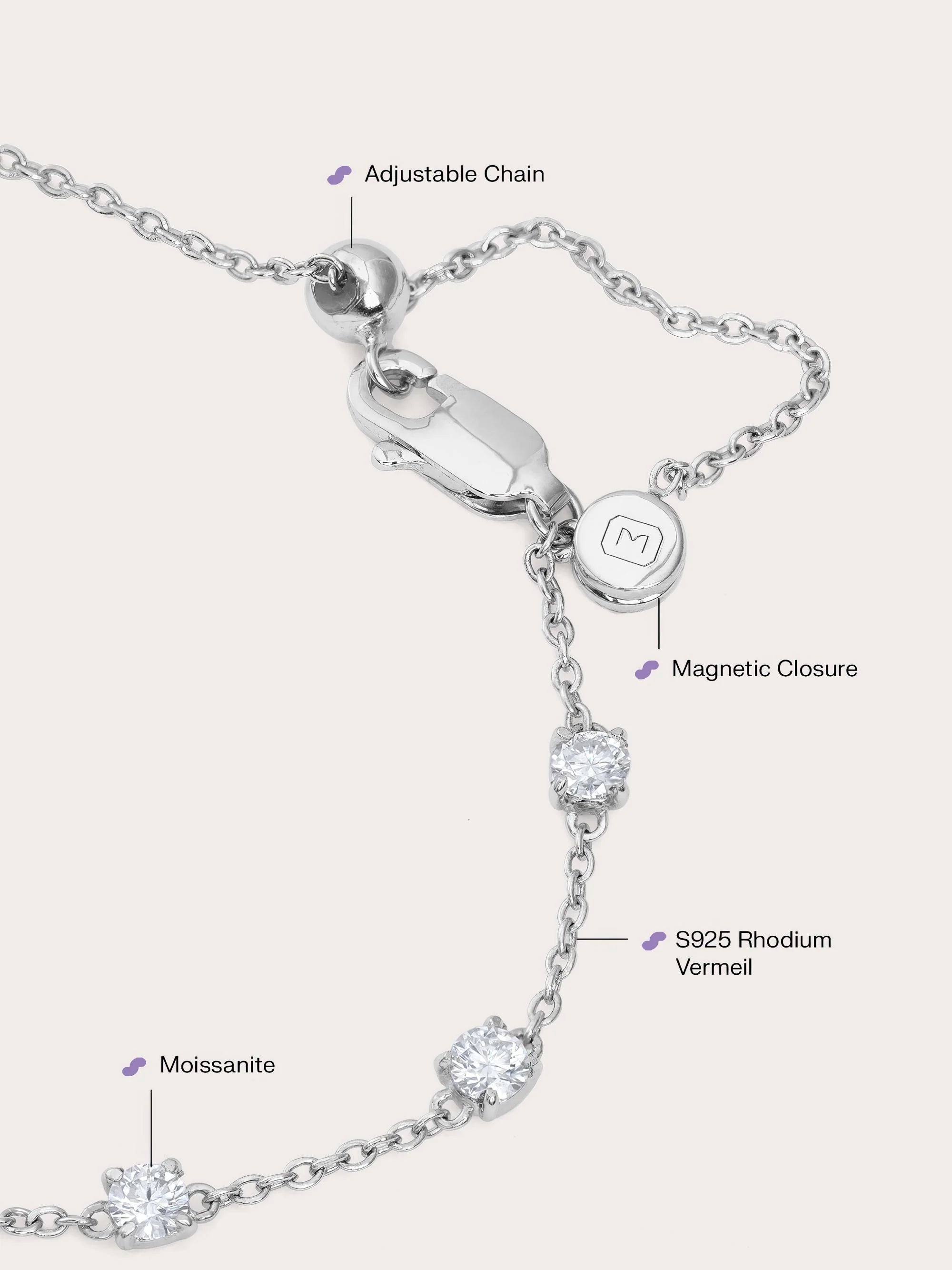 Inspired by the enchanting memory of the first snowfall, this bracelet features 7 dazzling white moissanites that shine like glistening snowflakes under the winter sun. It is hand - crafted using S925 rhodium vermeil.