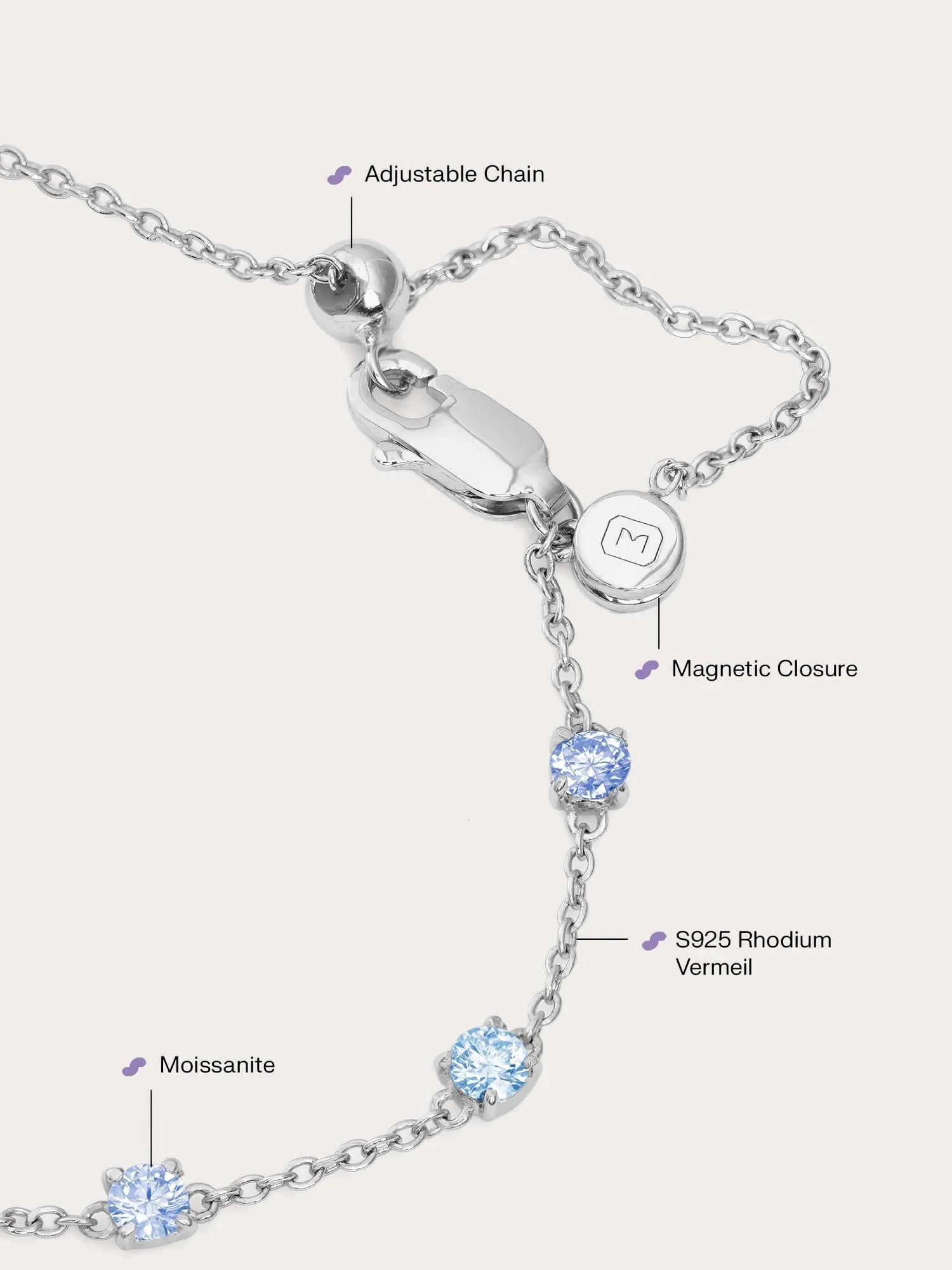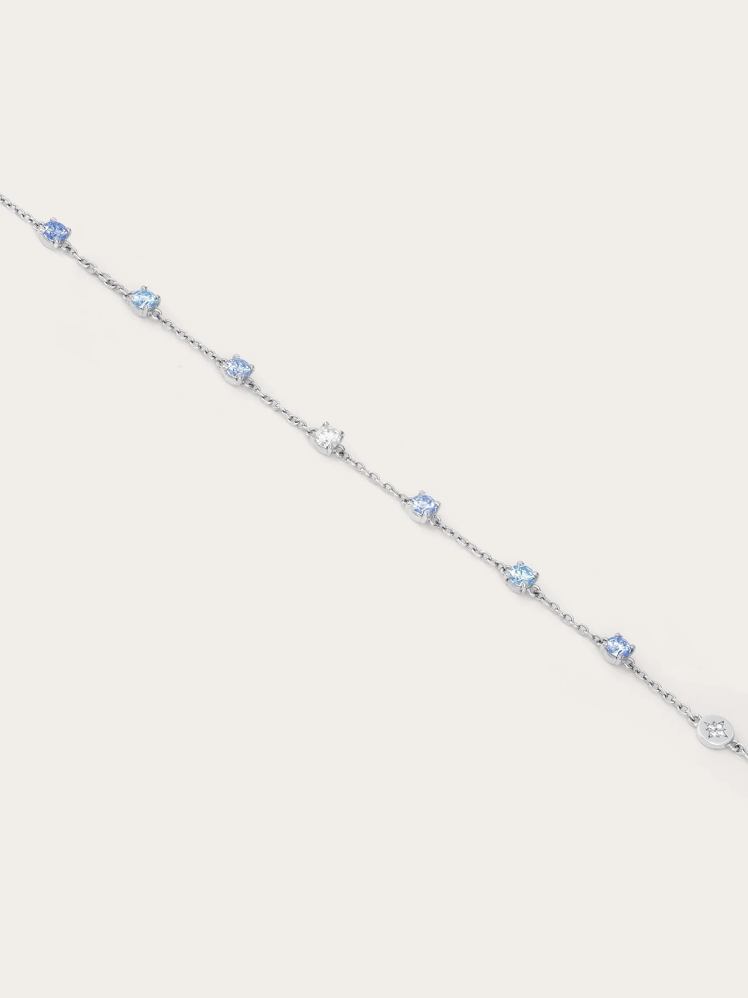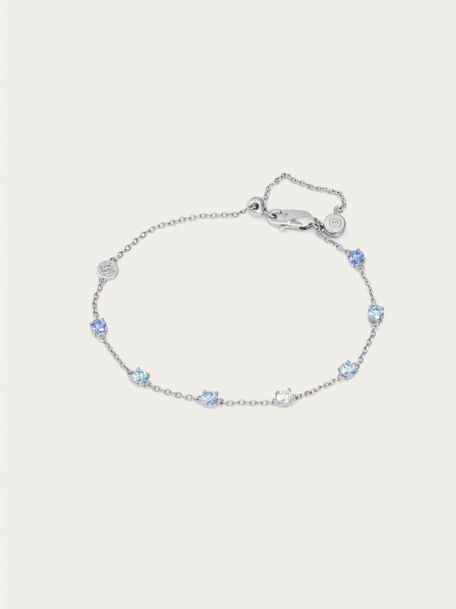 This bracelet features a gradient of 7 hand-set moissanite stones in ombre shades of blue and white. Inspired by the tranquility of winter, its delicate design combines timeless elegance with a modern twist. It is handcrafted using S925 rhodium vermeil.