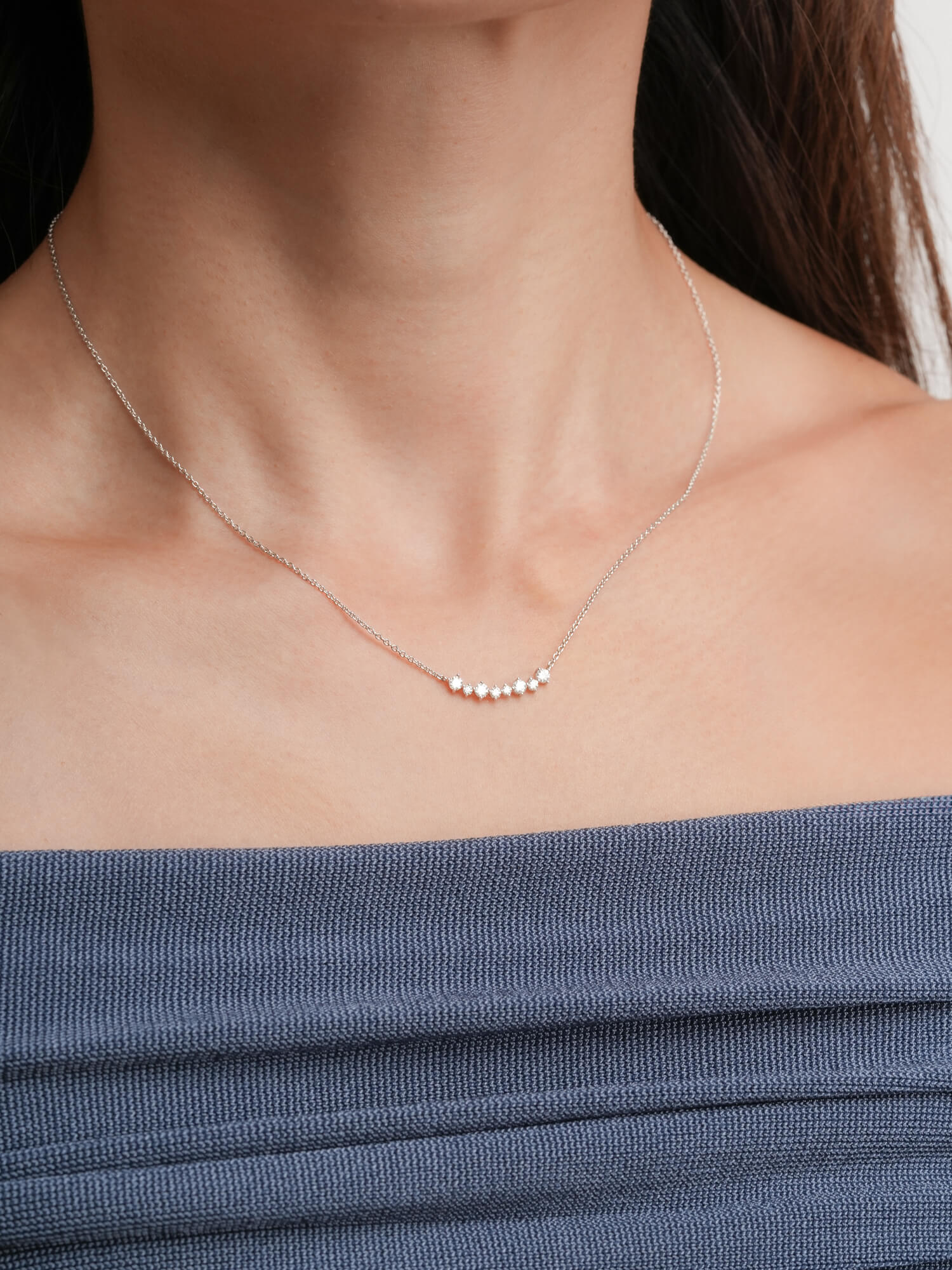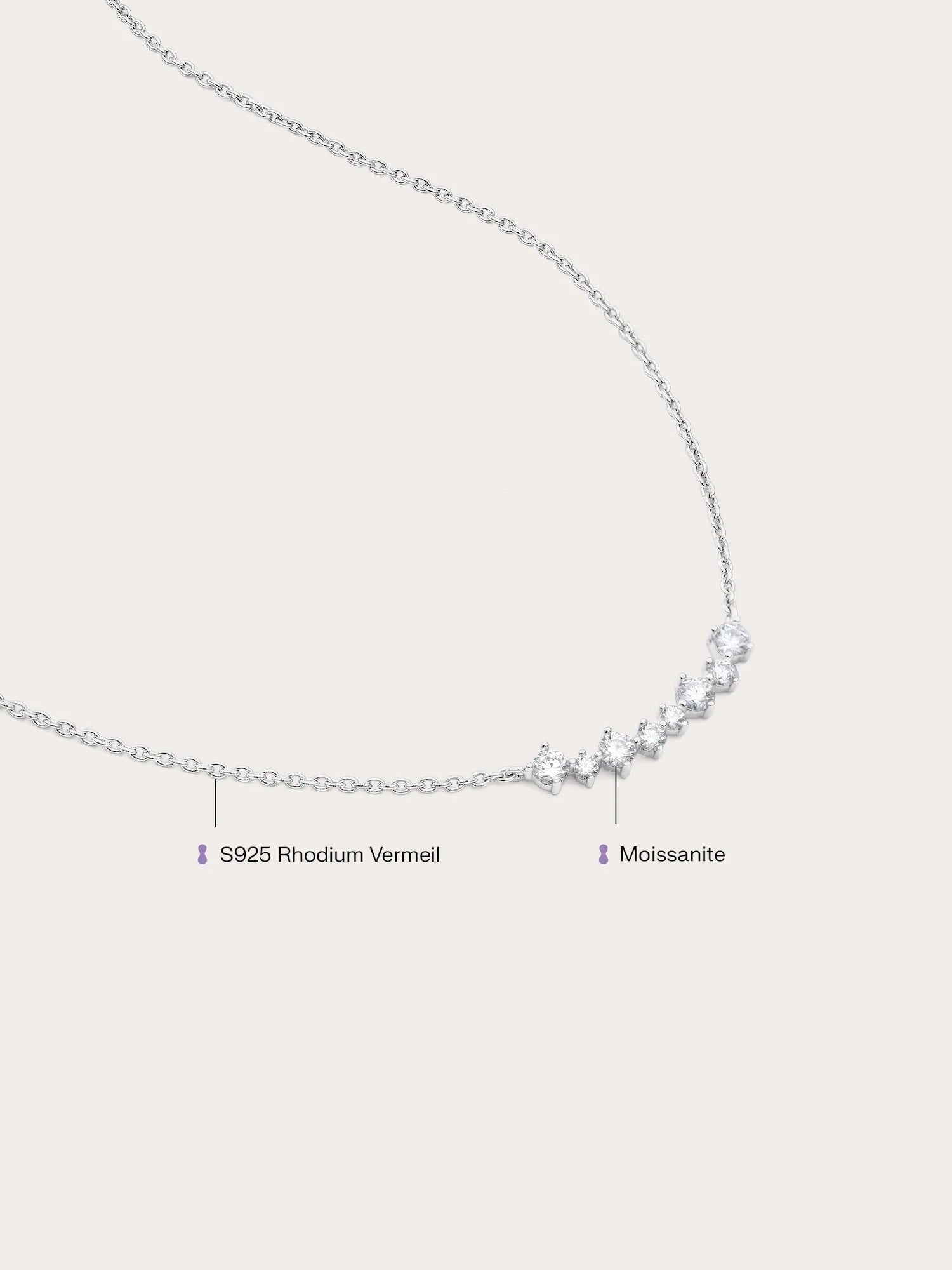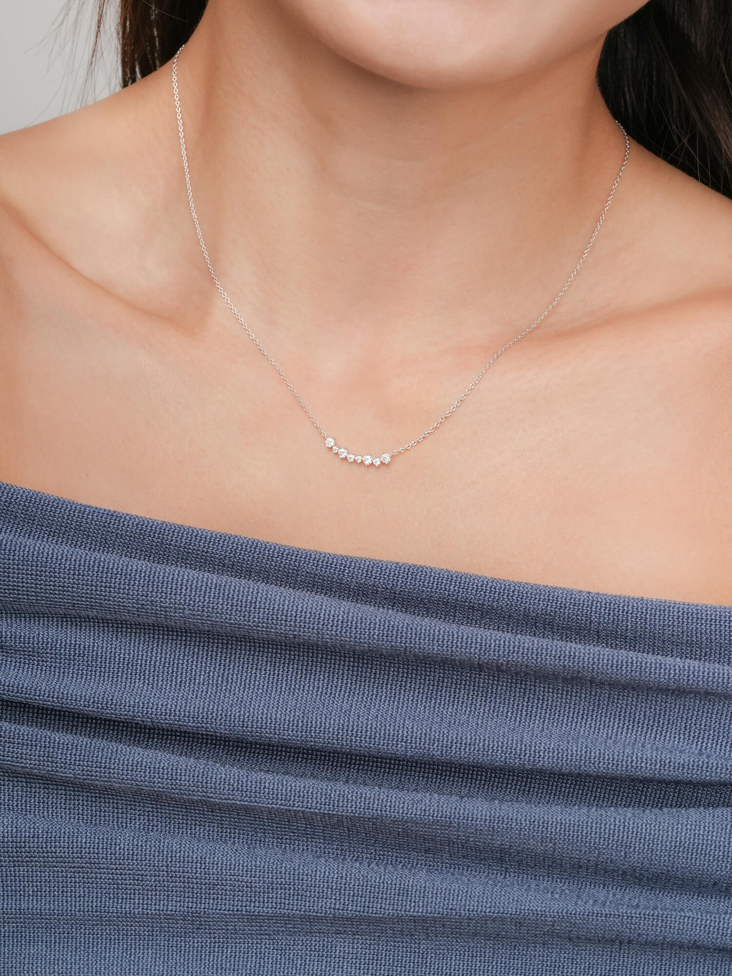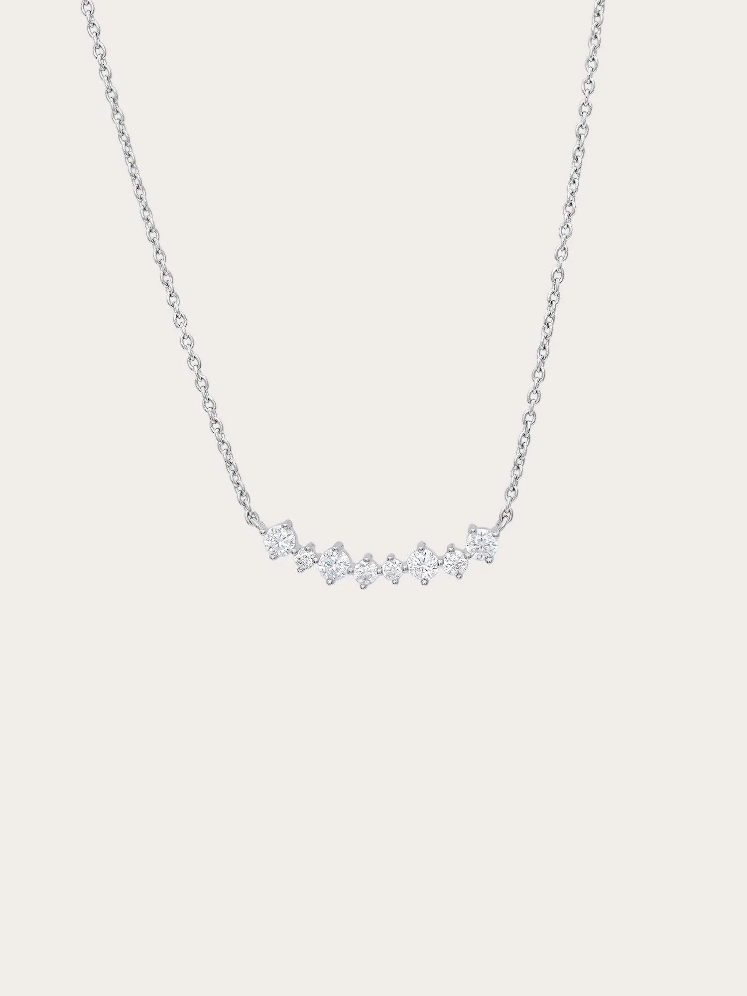 The Wishing Arc Moissanite Necklace features seven moissanite stones in varied sizes, elegantly arranged in a graceful arc, like scattered wishes in the night sky.