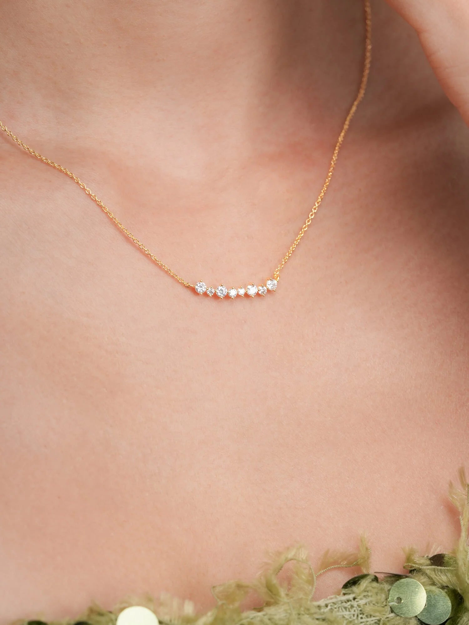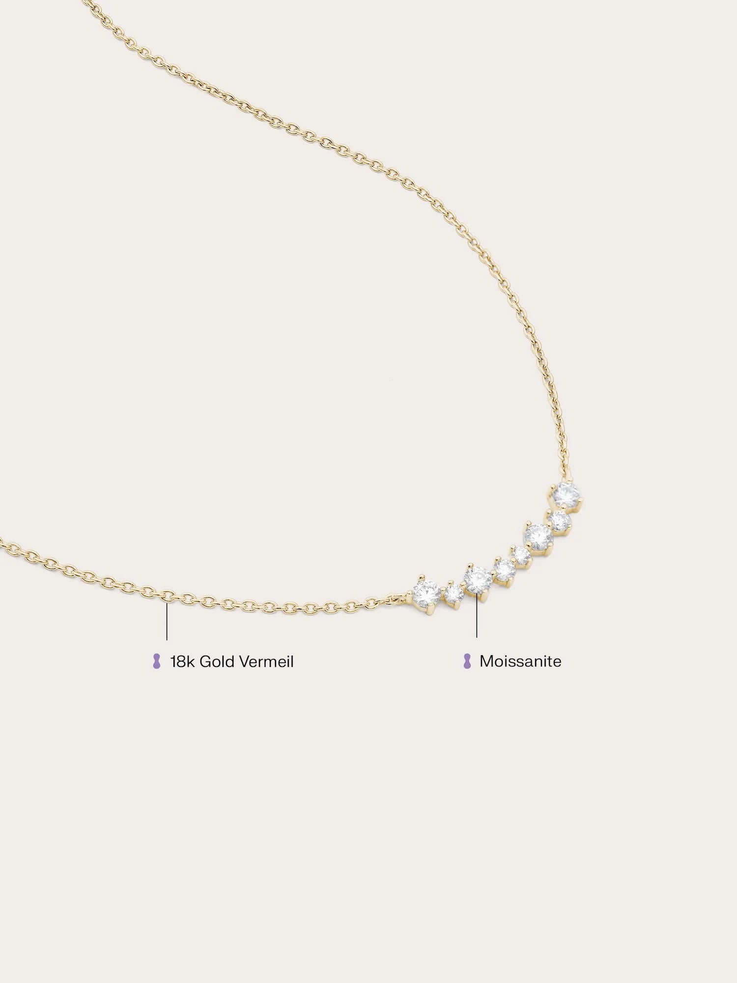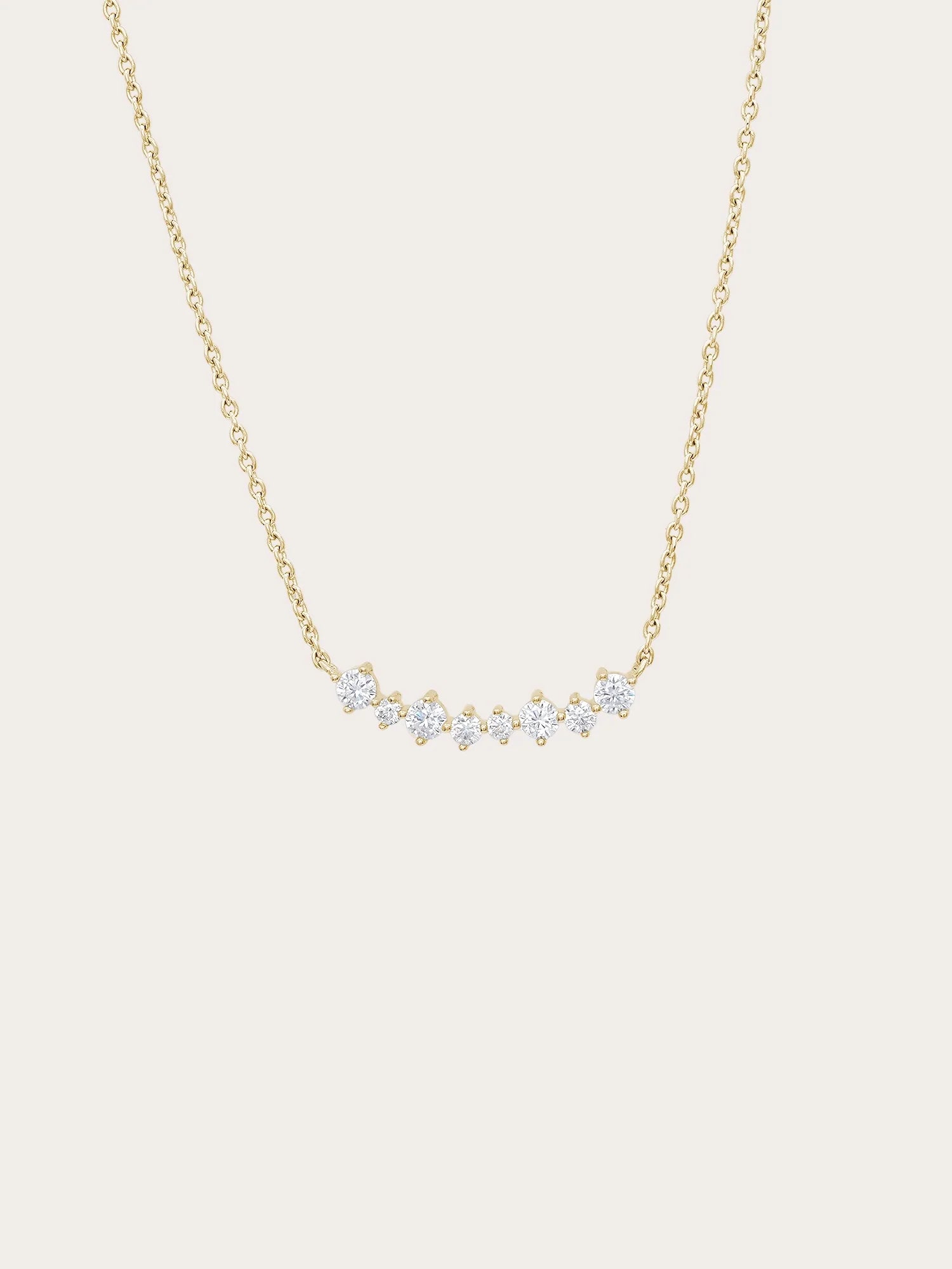 The Wishing Arc Moissanite Necklace features seven moissanite stones in varied sizes, elegantly arranged in a graceful arc, like scattered wishes in the night sky.