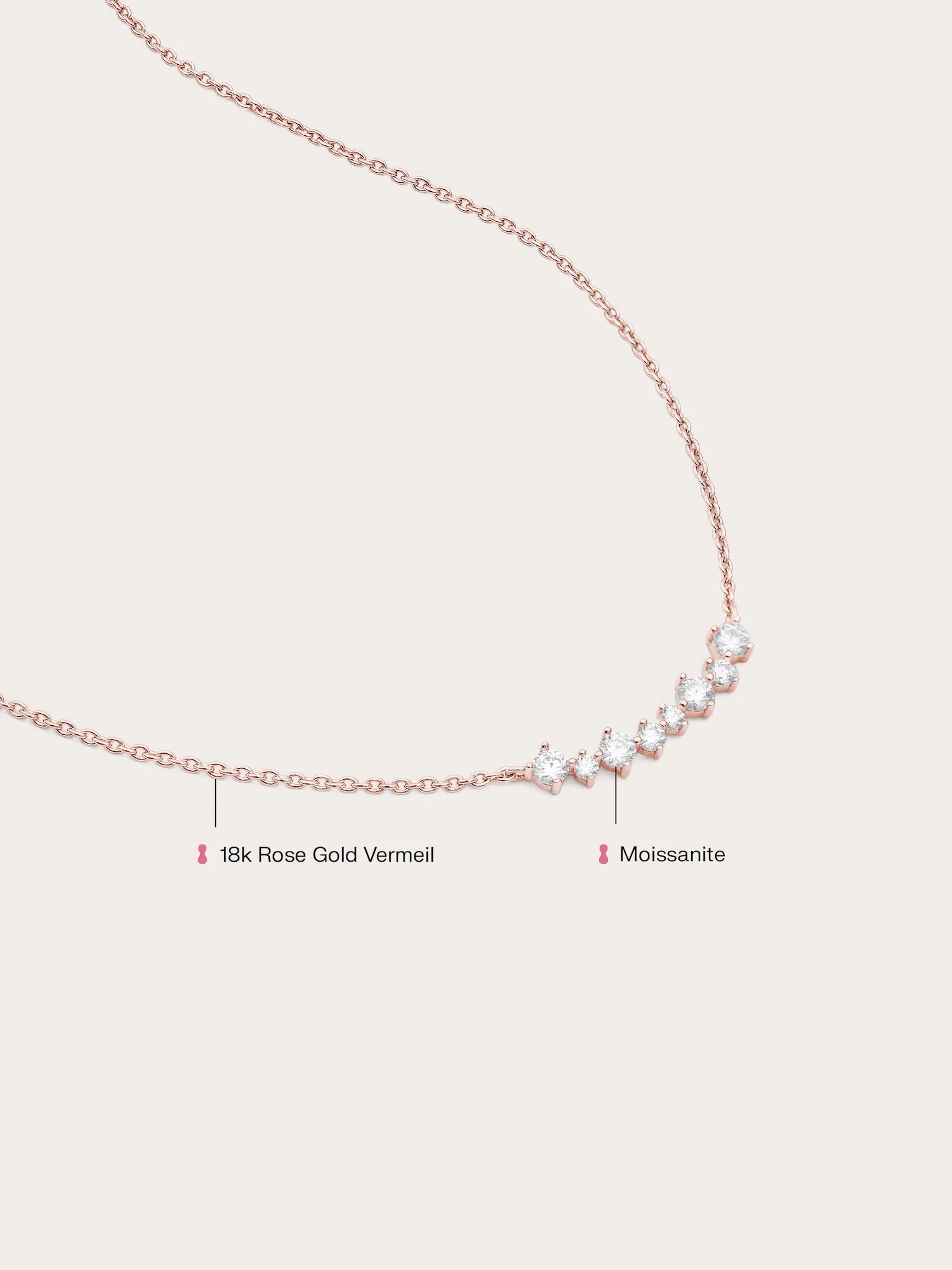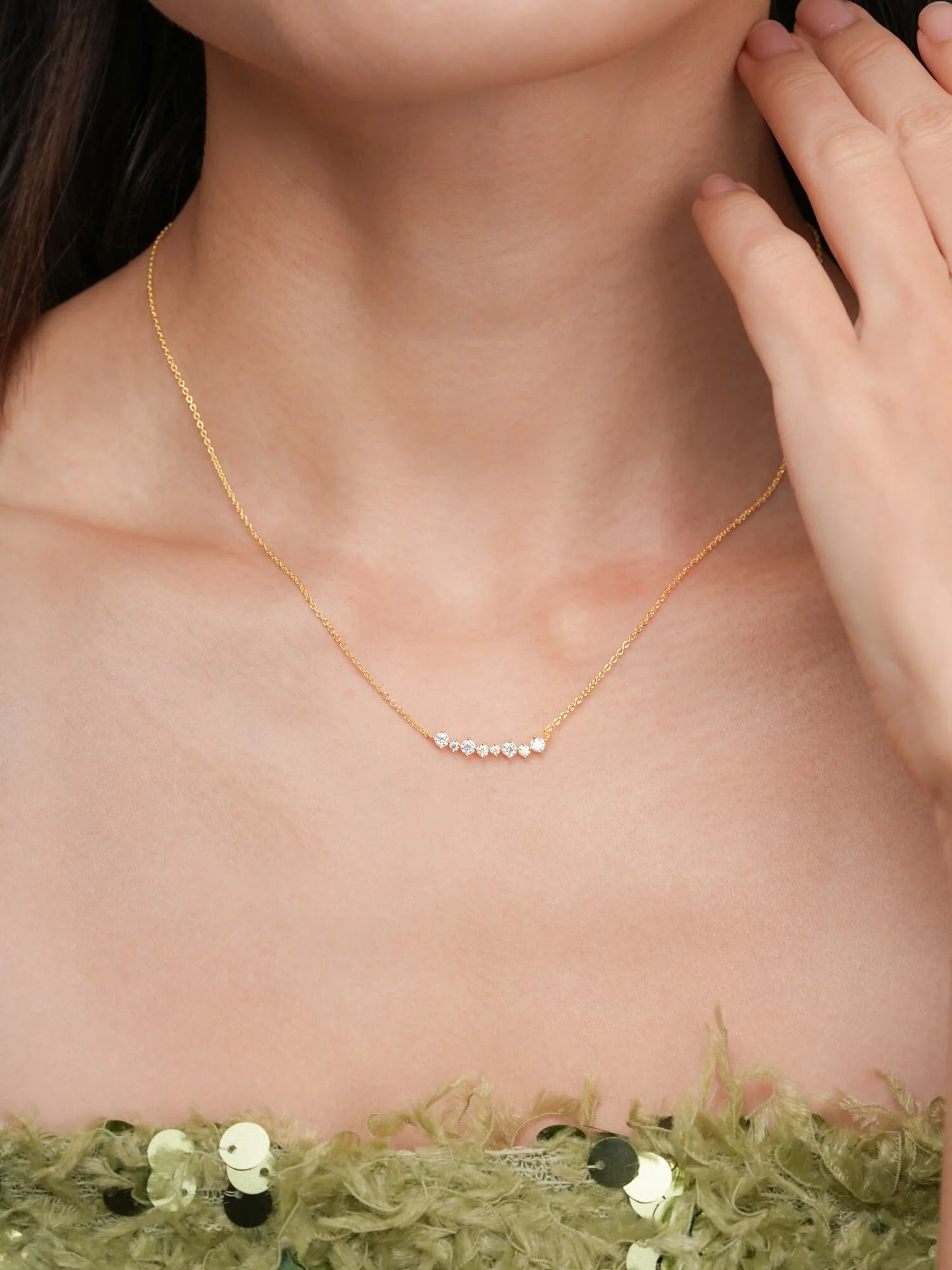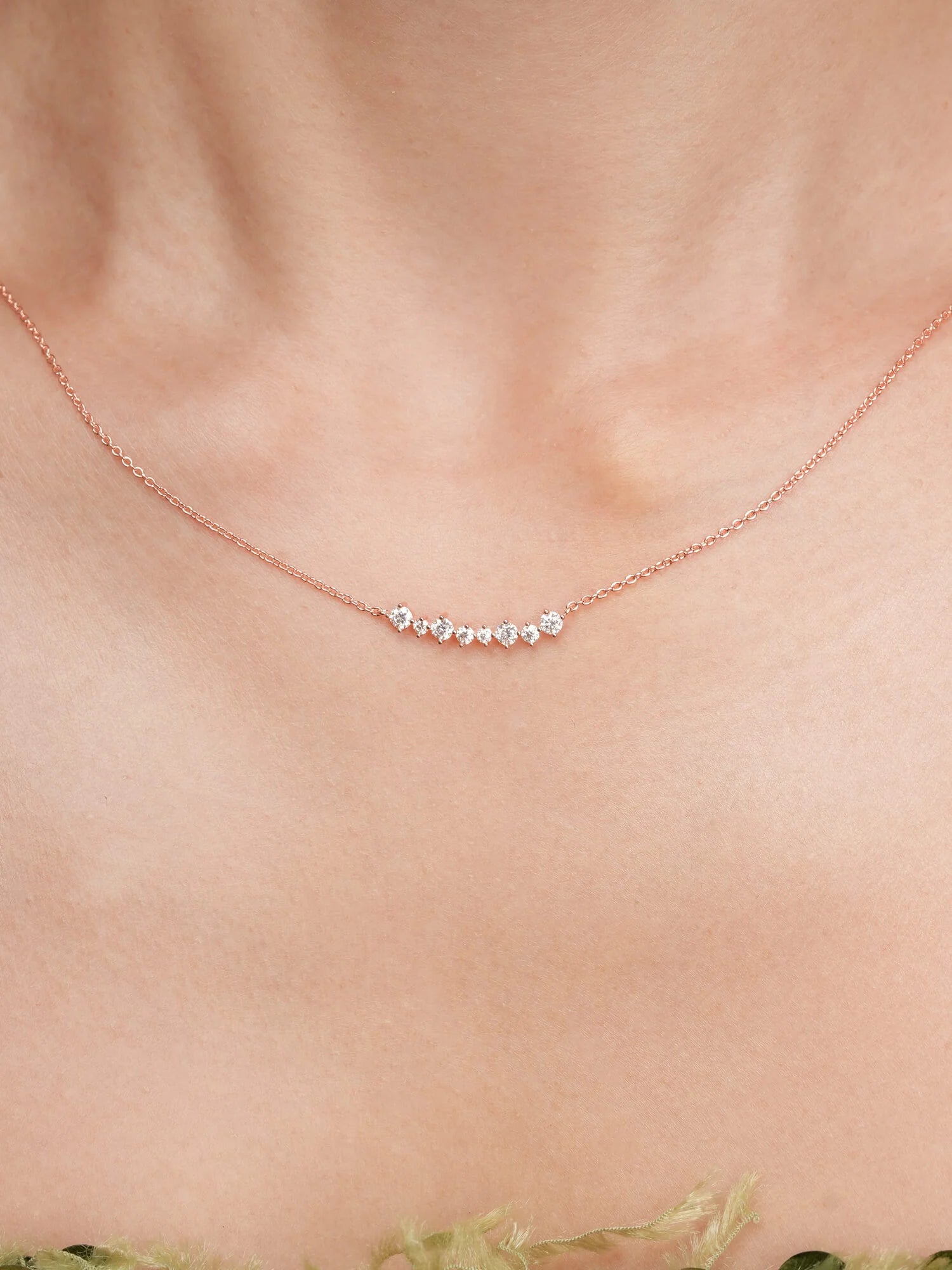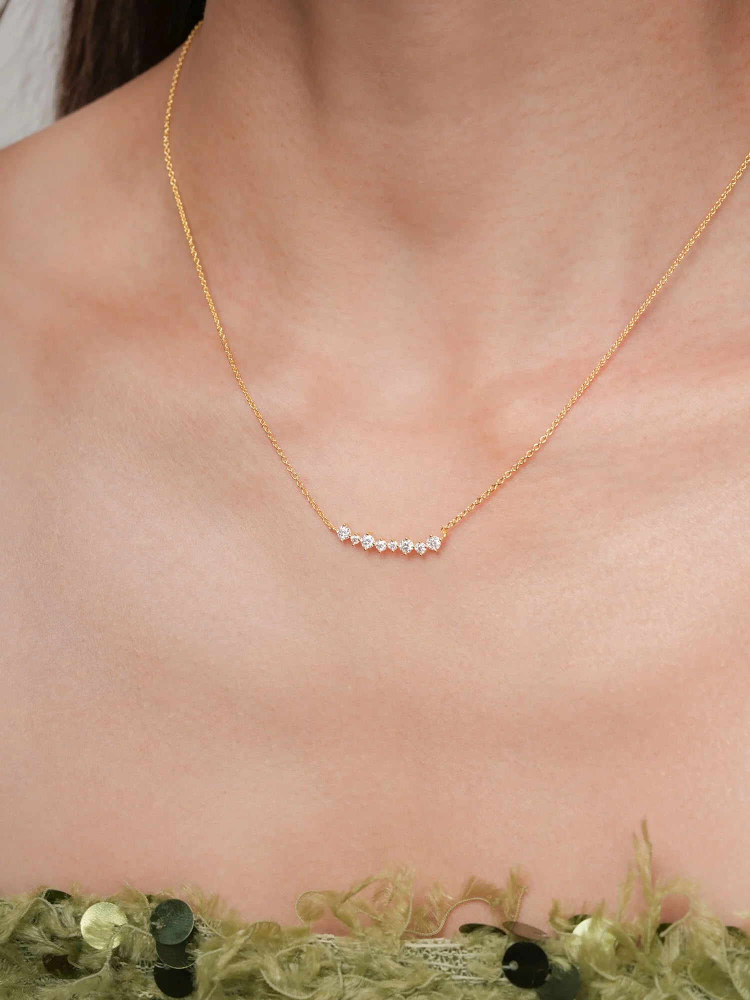 The Wishing Arc Moissanite Necklace features seven moissanite stones in varied sizes, elegantly arranged in a graceful arc, like scattered wishes in the night sky.