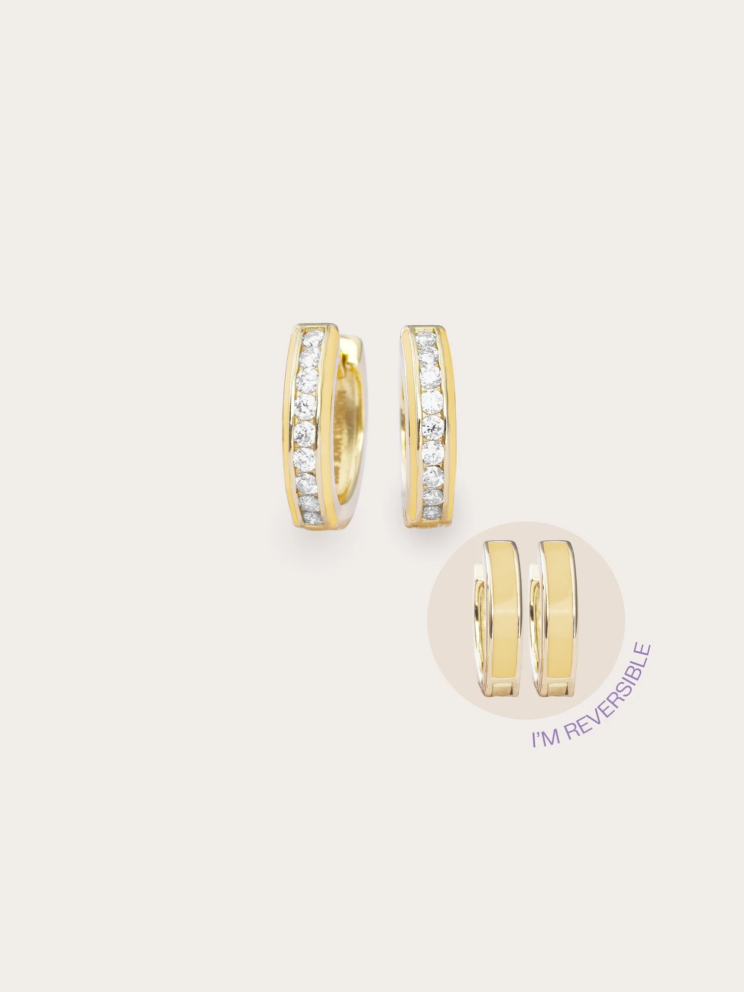 The yellow enamel moissanite reversible huggie earrings offer two styles in one piece. You can wear them in two ways: one side sparkles with pavé moissanites (accented by a hint of color), and the other side has a simple pastel yellow enamel finish. They are hand - crafted with a metal that has a thick layer of 18k gold plated on a base metal.