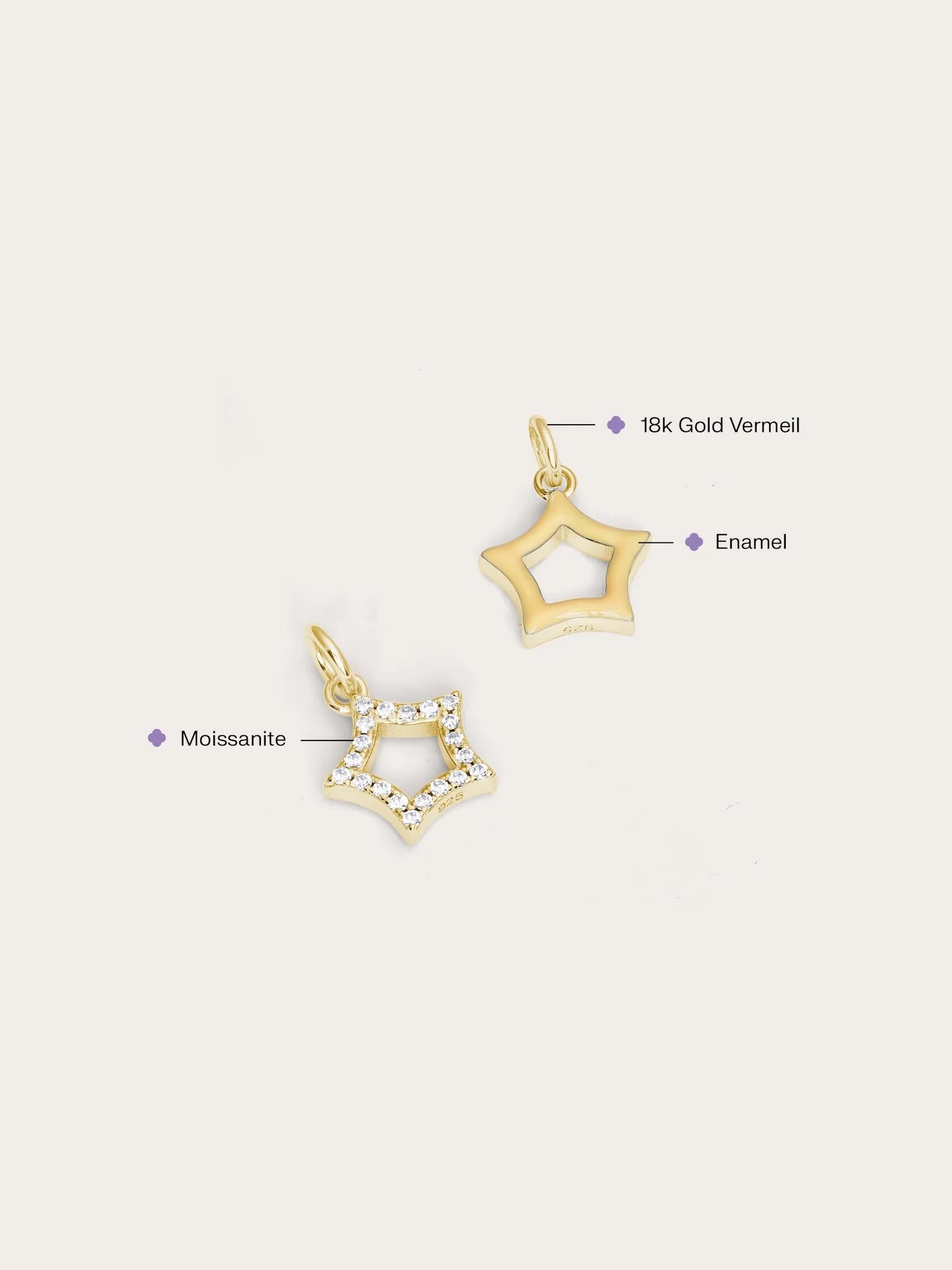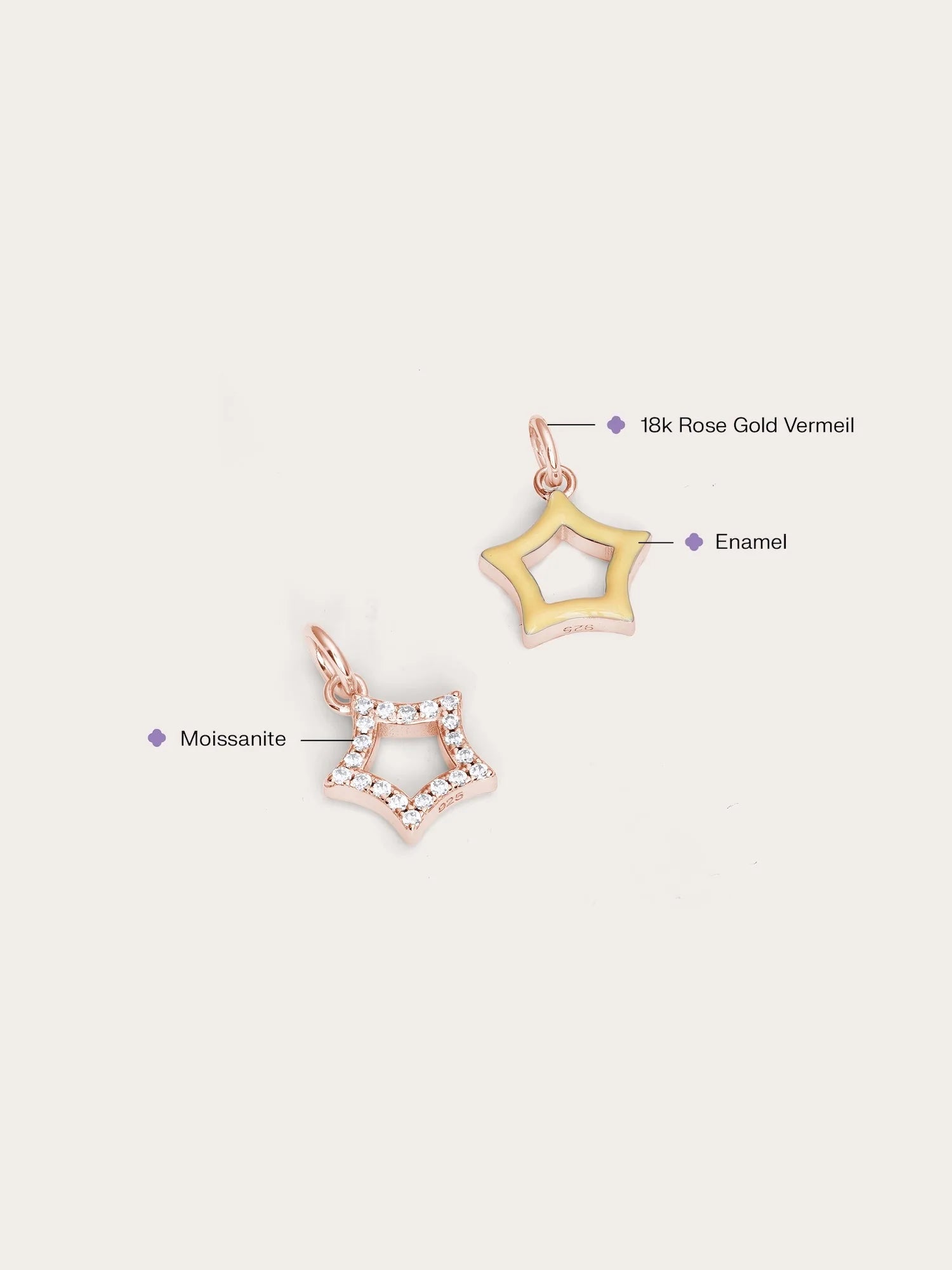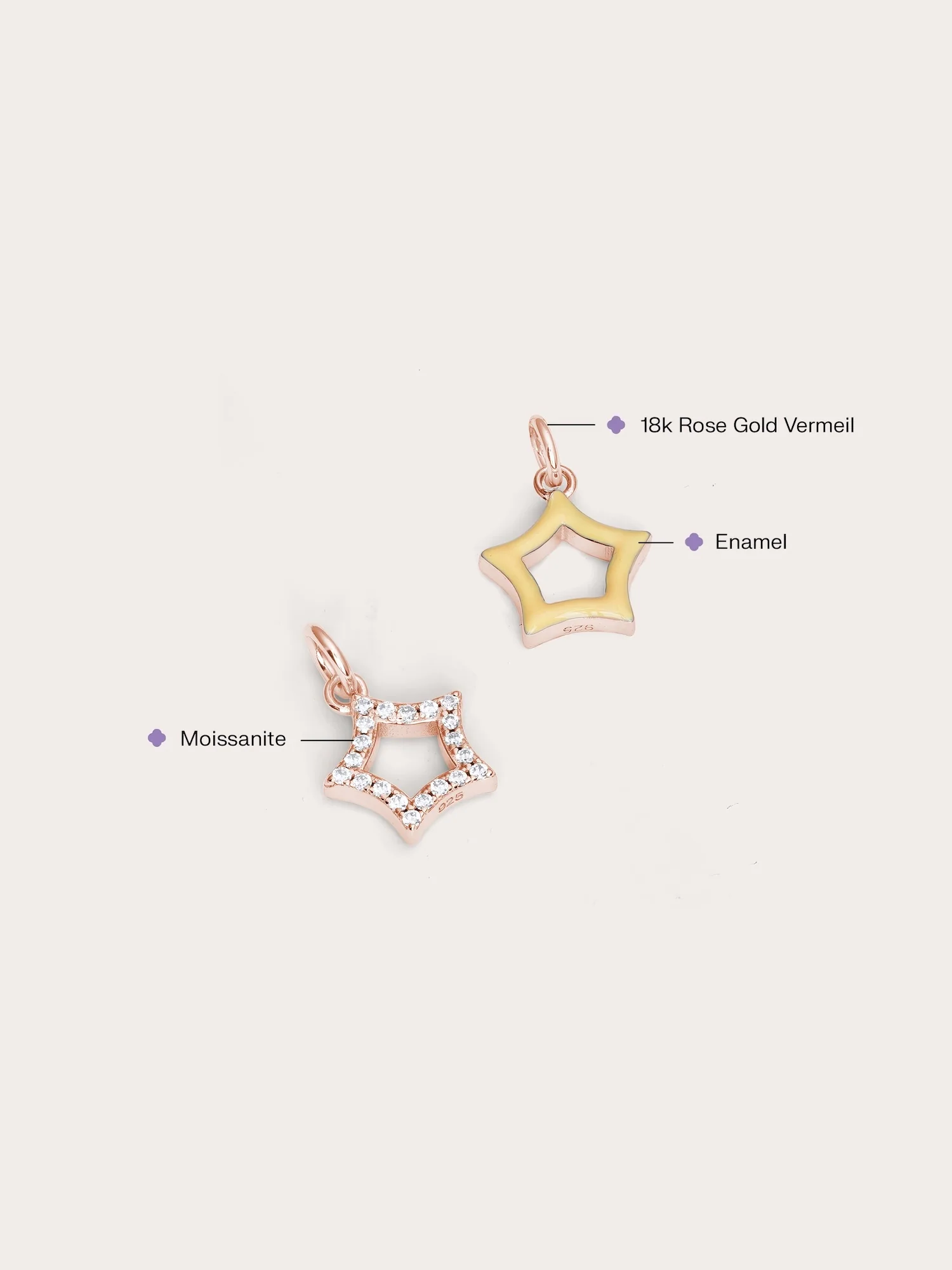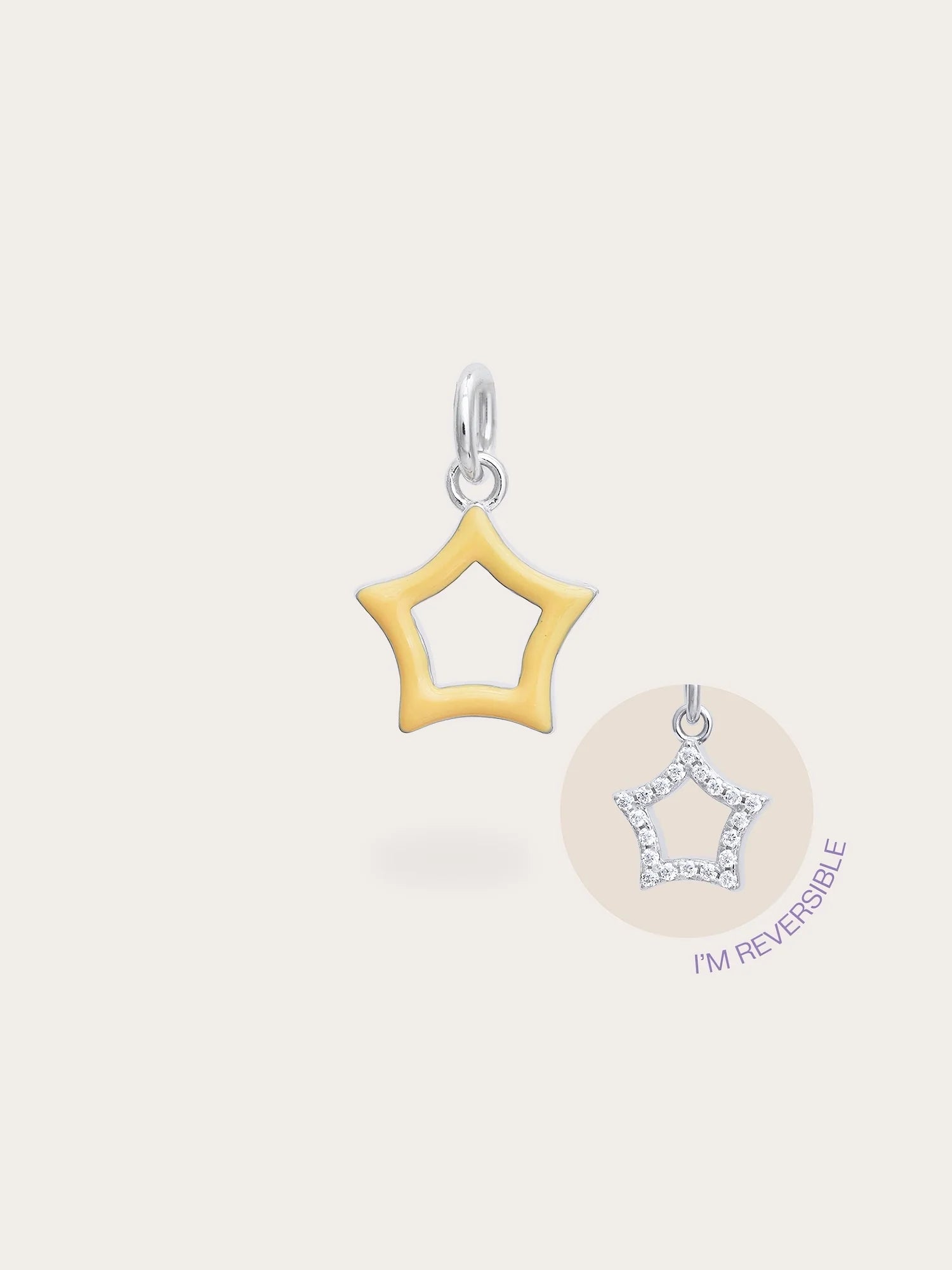 Bring a touch of brightness to your daily life with this yellow star pendant. It's versatile and reversible. One side features a hand - painted yellow enamel star, adding a splash of cheerful color, while the other side is adorned with sparkling pavé moissanites for a classic, brilliant look.
